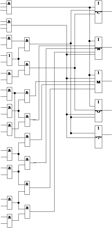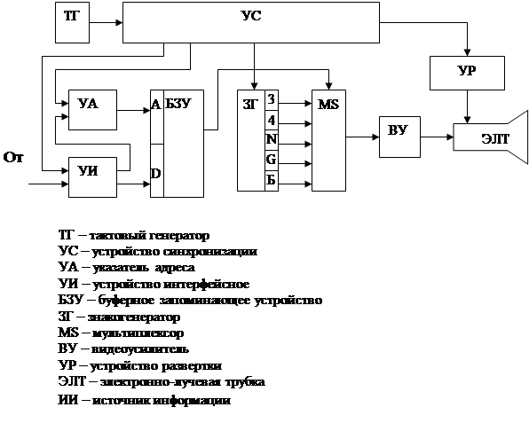 литературы. ВВЕДЕНИЕВ последние годы в связи с автоматизацией процессов производства и управления, развитием электронно-вычислительной техники и разработкой систем автоматизации исследовательских и технологических работ широкое распространение получили разнообразные устройства отображения информации. Если информация создается или передается электронными средствами , то она воспроизводится с помощью средств отображения информации, которые являются электронным переводчиком, позволяющим принимать закодированную электронными сигналами информацию. В задачах практики часто необходимо производить отображение алфавитно-цифровой информации, особенно в области АСУ. Реализация текстов в основном осуществляется на экране ЭЛТ. В данной курсовой работе разрабатывается устройство отображения пяти символов. Для изображения этих символов используется СОИ телевизионного типа, обладающее по сравнению с СОИ других типов рядом преимуществ. К ним относятся: универсальность, позволяющая отображать все виды информационных моделей, возможность совмещения информационных моделей, формируемых методом экранного синтеза, возможность использования стандартных телевизионных установок в качестве видеомониторов.
