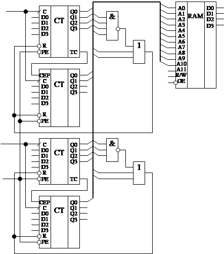 Рис.10 Функциональная схема модуля БЗУ Выбор счетчиков знакомест и текстовых строк. Из расчета БЗУ следует, что счетчик знакомест должен иметь 6 выходов и считать до 44, а счетчик текстовых строк-6 выходов и считать до 73. Для реализации требуемых счетчиков используем ИМС КМ555ИЕ19. ИМС представляет собой два одинаковых 4-х разрядных двоичных счетчика в одном корпусе. Способ реализации счетчиков знакомест и текстовых строк показан соответственно на рис. 11 и 12