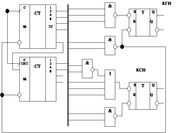 576 29 в) рис.15. Принцип работы данной схемы такой же , как и у схемы формирования ССИ и СГИ. При установлении на выходах счетчика комбинации на выходе триггера появляется КГИ, который гасится при 29-й комбинации на выходе счетчика. Аналогично срабатывает и КСИ. Интегрирующая RC-цепочка служит для того, чтобы счетчики и триггеры оставались в нулевом состоянии до тех пор, пока в цепях не закончатся переходные процессы, появляющиеся после включения питания, т. е. для начальной установки. Ее принцип действия следующий : В первый момент после включения питания напряжение на конденсаторе C1 Uk=0.Затем конденсатор начинает заряжаться через резистор R1 до напряжения Uпит. Когда Uk достигает величины минимального уровня логической единицы, счетчики и триггеры смогут работать. К этому времени переходные процессы должны закончиться. Пусть время переходного процесса tп=0.5 мс. Время зарядки конденсатора до Uпор не должно превышать tп, т.е. tc=R1C1ln (Uпит-Uко)/(Uпит-Uпор)>tп (2.17) где Uко - напряжение конденсатора в начальный момент; Uпит=5В – напряжение, до которого конденсатор стремится зарядиться; Uпор=2.4В