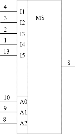 Рис.12.Счетчик текстовых строк. Сброс счетчиков знакомест и текстовых строк в нулевое состояние может осуществляться СГИ и КГИ, которые формируются устройством синхронизации. Выбор мультиплексора. Для того, чтобы преобразовать пятиразрядный параллельный код, поступающий из знакогенератора, в последовательный, удобно использовать мультиплексор.Данные из БЗУ подаются на адресные входы мультиплексора, в качестве которого можно выбрать ИМС 155КП5.Этот мультиплексор позволяет коммутировать данные от восьми входов на общую выходную линию.Ток потребления этой ИМС 43 мА. Схема цоколевки мультиплексора представлена на рис.13.