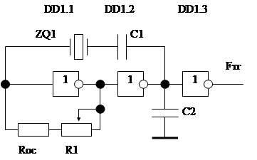 K*χ>=1 (2.22) φk*φχ=2πn (2.23) где n=0,1,2… K-коэффициент усиления разомкнутого звена; Χ-κоэффициент обратной связи. Усиление, согласно рис.16, обеспечивается DD1.1 и Rос. Положительную обратную связь обеспечивают DD1.2, ZQ и C1. R1 служит для подстройки частоты. Rос необходимо для выведения DD1.1 в линейный режим. Для усилительного звена генератора справедливы уравнения: K=Uвых/Uвх (2.24) Uвх=(Uвых1*Rвх)/(Rос+Rвх) (2.25) где Rвх-входное сопротивление DD1.1. Из (2.24) и (2.25) следует: K=Rос/Rвх+1 (2.26) Для второго (инвертирующего) звена справедливо χ=Uвых2/Uвх2 (2.27) Uвых2=Uвх2/(Z+Rвх) (2.28) Из (2.27) и (2.28) следует: χ=Rвх/(Z+Rвх) (2.29) где Z-сумма комплексных сопротивлений кварцевого резонатора и конденсатора С1. Элемент DD1.3 применяется как буферный, чтобы уменьшить влияние нагрузки на частоту генератора. Принимаем частоту тактового генератора 16 МГц. Выбираем кварцевый резонатор с частотой возбуждения, равной выходной частоте ТГ. Z=Zzq1+1/(2*π*fтг*С1) (2.30) Где Zzq1-комплексное сопротивление кварцевого резонатора, равное 50 Ом. Rвх для DD1 определяется по максимальному входному току ИМС .В качестве DD1-DD3 выбираем ИМС 1533ЛН1, имеющую Iвхmax=Iвх0=0.2мА, Uвх0=0.5 В. Rвх=Uвх0/Iвх0=2.5 кОм