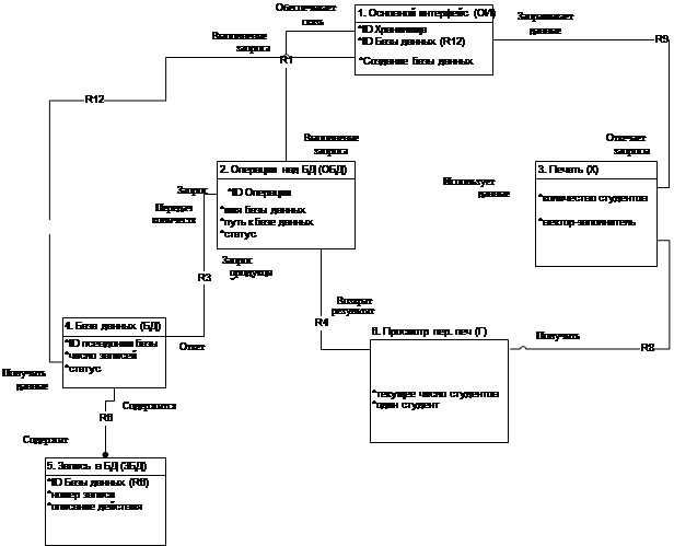 Реферат: Система рейтингового контроля знанийРеферат: Система рейтингового контроля знанийПриднестровский Государственный Университет им. Т. Г. Шевченко Кафедра АСОИиУКурсовая работапо дисциплине «Технология программирования» на тему: Система рейтингого контроля знаний . Работу выполнили: Работу проверили: студент ИТФ –96В преподаватели: Кольцов Е.С. Галюшина О.В. Тирасполь 1999 г.Содержание:Задание на курсовую работу 1.1 Задание 4 1.2 Реализация 4 Введение Глава I:Системы поддержки принятия решений1. Система Paradox Глава II: Особенности объектно-ориентированного анализа 19 Информационная модель 21 Модель состояний для объекта «Операции над БД» 22 Модель состояний для объекта «Ввод в базу» 25 Модель взаимодействия объектов 26 Таблица переходов в состояния для объекта «Операции над БД» 27 Таблица переходов в состояния для объекта «Ввод в бузу» 28 Список событий 29 ДПДД для состояния «Инициализация» объекта «Операции над БД» 40 ДПДД для состояния «Создание БД» объекта «Операции над БД» 40 ДПДД для состояния «Открытие БД» объекта «Операции над БД» 41 ДПДД для состояния «Редактирование БД» объекта «Операции над БД» 41 ДПДД для состояния «Закрытие БД» объекта «Операции над БД» 42 ДПДД для состояния «Ввод данных» объекта «Операции над БД» 42 ДПДД для состояния «Сохранение БД» объекта «Операции над БД» 43 ДПДД для состояния «Неуспешное открытие БД» объекта «Операции над БД» 43 ДПДД для состояния «Обновление БД» объекта «Операции над БД» 44 Текст программы 47 Список использованной литературы 77 Задание на курсовую работупо дисциплине «Технология программирования» тема: Система рейтингого контроля знаний . 1.1 Задание В данной курсовой работе было необходимо написать программу, с использованием объектно-ориентированного метода программирования и объектно-ориентированного анализа, которая позволяла бы вести учетную запись студентов по десяти предметам с оценкам. В программу заноситься Ф.И.О. студента, факультет на котором он учится, специальность, которую приобретает и группа соответственно. Программа автоматически считает средней балл и заносит его в базу. Данная программа сортирует, находит и фильтрует данные по студентам, что облегчает поиск или просмотр перед печатью нужных студентов. Результатом программы является вывод перед печатью всех студентов или по каждому студенту соответственно. 1.2 Реализация Данная программа была реализована на объектно-ориентированном языке С++ и написана в среде разработчика программного обеспечения С++Builder. Введение îáúåêòíîå ïðîãðàììèðîâàíèå: Òðàäèöèîííàÿ òåõíîëîãèÿ ïðîãðàììèðîâàíèÿ 70-õ ãîäîâ - ñòðóêòóðíîå ïðîãðàììèðîâàíèå: - ìîäóëüíîå ïðîãðàììèðîâàíèå; - íèñõîäÿùåå ïðîãðàììèðîâàíèå; - ñòðóêòóðíîå ïðîåêòèðîâàíèå ïðîöåäóð è äàííûõ (ïðîãðàììèðîâàíèå áåç goto). ßçûê Ïàñêàëü - ñîîòâåòñòâóåò óêàçàííûì ïðèíöèïàì è áûë ðàçðàáîòàí ïîä âëèÿíèåì èäåé ñòðóêòóðíîãî ïðîãðàììèðîâàíèÿ. Àëüòåðíàòèâíûé ïîäõîä - âîñõîäÿùåå ïðîãðàììèðîâàíèå - ïðåäïîëàãàåò â ïðîñòåéøåì ñëó÷àå ñîçäàíèå ñëîÿ ñòðóêòóð äàííûõ è ïðîöåäóð, îáåñïå÷èâàþùèõ ïîëíûé íàáîð äåéñòâèé íàä îáúåêòàìè, êîòîðûå ïðåäñòàâëåíû â äàííîé çàäà÷å. Ïðèìåð òðàäèöèîííîãî ïîäõîäà áèáëèîòåêà ñòàíäàðòíûõ ôóíêöèé. Ñëåäóþùèé øàã - ââåäåíèå â ïðîãðàììó îáúåêòîâ. Ïîä îáúåêòîì ïîíèìàåòñÿ ñòðóêòóðà äàííûõ, êîòîðàÿ ñîäåðæèò ïîëíóþ èíôîðìàöèþ î ñîñòîÿíèè ñîîòâåòñòâóþù