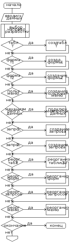 ОписаниеФФффуввыа блоков схемы алгоритма решения задачи. Блок 1 – ввести имя (обозначение) задачи, ввести дату и время, используя символьные клавиши основной части клавиатуры и управляющие клавиши F1–F10. Блок 2 – разработать элемент с помощью установки курсора на соответствующую опцию, обслуживающую меню пакета (СУБД) и нажать клавишу ENTER. Блок 3 – блок условия о создании таблиц: если Да, идти на блок 4; если Нет то на блок 5. Блок 4 – создание таблицы Т, используя вышеперечисленные клавиши блока 1 и специальные команды редактора таблиц. Блок 5 – условие создания формы F1: если Да – блок 6, если Нет –блок 7. Блок 6 – создание формы F1 с использованием перечисленных клавиш и команд. Блок 7 – условие создания формы F2: если Да – блок 8, если Нет – блок 9. Блок 8 – создание формы F2 с использованием аналогичных клавиш и команд. Блок 9 – условие создания пользовательского меню: если Да – блок 10. Пояснения к записям: в ней содержатся сведения о слушателях, Ф.И.О., номер служителя. 1-ый запрос: сведения о средних даллах; 2-ой запрос: диаграмма результатов контроля знаний слушателей ППК.