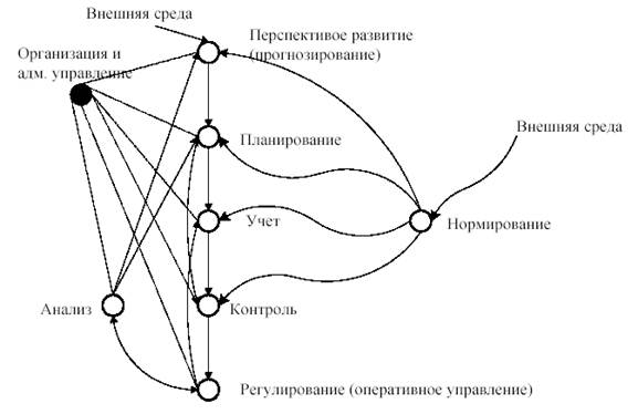 Рис. 2. Схема взаимосвязи функций управления Учет - это функция регистрации, сбора, передачи и обработки и обобщении текущих сведений в подразделениях объекта управления о выполнении плана. Контроль на предприятии состоит в проверке - все ли протекает согласно принятой программе, установленным организационным принципам и данным распоряжениям. Его целью является выявление фактов невыполнения программы, допущенных ошибок с целью исправления и избежания их повторения в дальнейшем. Контроль применяется ко всему: к материальным объектам, действиям, людям. Для того чтобы контроль был действенным, его нужно проводить своевременно и сопровождать соответствующими санкциями. По результатам контроля принимаются управленческие решения, направленные на выработку новых планов, реорганизацию производственной системы, активизацию и координацию ее деятельности. Таким образом, запускается новый цикл функционирования системы. Цель координации и контроля – эффективно действующая производственная система. Оперативное управление. Когда производственная система подготовлена к работе и ее нужно активизировать или когда намечаются сбои в ее работе, необходимо заставить действовать эту систему. Данная функция реализуется путем выдачи распоряжений. Обычно она распределяется между несколькими руководителями, причем каждый берет на себя определенный круг обязанностей и несет ответственность за их выполнение. После активизации производственная система становится действующей. Анализ деятельности системы основан на проведении обработки полученных сводных данных и определении тенденций в поведении системы и процессов, протекающих в ней, и получении сведений о ресурсах предприятия, которые используются при составлении нового плана. Нормирование - это функция определения норм расхода сырья, материалов, труда и т.д. для выполнения заданий каждому работнику, участку и цеху, рассчитываемые на основе среднеотраслевых норм. Организация - это обеспечение предприятия всем тем, что необходимо для его благополучного функционирования: сырьем, оборудованием, деньгами, персоналом и т. п. Обладая необходимыми ресурсами, оно должно функционировать соответствующим образом и выполнять поставленные цели. Результатом выполнения данной функции является созданная производственная система. Следует отметить, что на первоначальном этапе существования экономической системы организация подразумевает разработку модели производственной системы, т. е. ее логического описания, а также проектирование ее структуры - состава элементов и взаимосвязей между ними. Администрирование подразумевает согласование деятельности всех участников процесса таким образом, чтобы улучшить функционирование предприятия и обеспечить его успех. Это значит - учитывать в отношении каждой подсистемы предприятия (технической, финансовой, коммерческой и т. д.) те взаимосвязи, которые существуют между ней и ее окружением, и те последствия, которые оказывает ее функционирование на связанные с ней подсистемы. Для достижения поставленной для экономической системы цели работники аппарата и объекта управления участвуют в выполнении деловых процессов (бизнес - процессов) и процедур. Деловые процессы - это процессы, которые отвечают за ведение бизнеса или выполнение целевой фун
