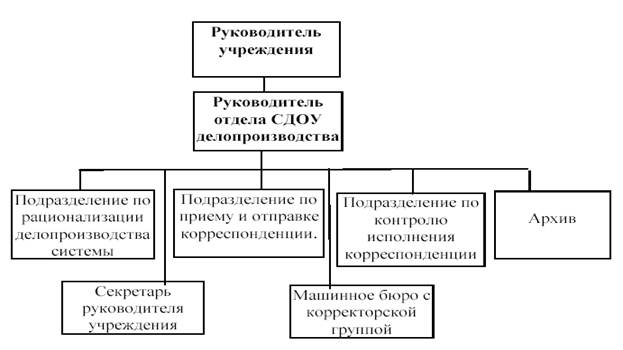 Рис. 4. Организационная структура СДОУ Руководитель данной службы подчиняется непосредственно руководителю. Подразделение "По рационализации делопроизводства системы" предназначено вести нормативную базу и методическое обеспечение СДОУ, организовывать делопроизводство и документооборот на предприятии в целом и контролировать его организацию в каждом подразделении, осуществляя постоянный мониторинг делопроизводственных процессов, процессов хранения и исполнения документов. Подразделение "По приему и отправке корреспонденции" осуществляет получение, фильтрацию и оформление потоков входящей и исходящей документации на предприятии. Подразделение "По контролю исполнения корреспонденции" выполняет функцию контроля за своевременностью исполнения документированных решений. "Архив" осуществляет сбор и хранение исполненных документов после их обработки, поиск и выдачу необходимых документов для выполнения следующих деловых процедур или функций управления. Подразделение "Машинное бюро с корректорской группой" предназначено для печати и корректировки составленных специалистами внутренних документов, направляемых в соответствующие подразделения согласно регламента для их обработки и исполнения. Секретарь руководителя учреждения осуществляет работу по составлению и отслеживанию ежедневных планов работы руководителя, документированию его поручений и контролю их исполнения. Все операции, выполняемые службами СДОУ любого уровня, основываются на требованиях нормативной базы по организации ДОУ на предприятиях и в организациях РФ. На сегодняшний день в Российской Федерации действует ряд общегосударственных нормативов и методик, регламентирующих наиболее общие правила организации работы с документами и устанавливающих требования к оформлению официальных документов. Разработка таких документов преследует ряд целей: · обеспечение юридической силы документа; · закрепление технологии обработки документов, позволяющей обеспечить организацию длительного их хранения и последующего использования; · создание основы наиболее рациональной технологии обработки документов и ее дальнейшее совершенствование. В 1991 г. была создана Государственная система документационного обеспечения управления (ГСДОУ). ГСДОУ – это совокупность научно обоснованных принципов, правил, нормативов и рекомендаций, устанавливающих единые требования к документированию управленческой (административной) деятельности и организации работы с документами в органах государственного управления, на предприятиях (объединениях), в учреждениях и др. Этот документ был направлен на нормативное закрепление изменений, произошедших в службах делопроизводства в связи с появлением негосударственных форм собственности. Его основными целями являются упорядочение документооборота, сокращение количества и повышение качества документов и, в конечном итоге, совершенствование работы аппарата управления. Составными компонентами ГСДОУ являются: · Единые правила составления и оформления документов по РФ. · Рациональные принципы документооборота. · Единые правила создания учетно-справочной системы. · Формы и методы контроля исполнения документов. · Правила составления номенклатуры дел. · Принципы формирования дел. · Правила подготовки дел к посл