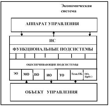 Таблица 1 5. Понятие экономической информационной системы. Классы, структура, особенности ИС. Особенности корпоративной экономической системыВсе информационные процессы, протекающие в подразделениях аппарата управления можно разделить на два вида: формализуемые процессы, для которых существуют алгоритмы обработки информации и не формализуемые процессы. Для автоматизации формализуемых процессов (составляющих до 90% всех процессов) используются специально разрабатываемые для предприятий и организаций экономические информационные системы. Экономическая информационная система (ИС) представляет собой совокупность программных, технических и информационных средств, предназначенных для автоматизации операций сбора, обработки, хранения и выдачи результатной информации пользователям для принятия управленческих решений. ИС - это сложная кибернетическая система, объединяющая потоки информации аппарата и объекта управления экономической системы, в составе которой можно выделить две группы подсистем: функциональные и обеспечивающие (рис. 6).