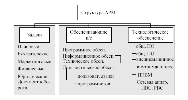 Рис. 6. Схема структуры ИСФункциональная подсистема представляет собой совокупность задач, объединенных общей информационной базой, с помощью которых автоматизируется выполнение функций управления в конкретных подразделениях предприятия. Принято выделять типовые функциональные подсистемы для каждого вида экономических например, для ИС предприятия выделяют следующие подсистемы: · перспективного развития или прогнозирования; · текущего планирования; · оперативного управления производством; · управления финансами; · бухгалтерского учета; · материально - технического снабжения; · маркетинга; · реализации и сбыта; · управления кадрами и др. Обеспечивающие подсистемы включают в свой состав документацию проектных решений, разработанных проектировщиками для предприятий - заказчиков с целью реализации каждой функциональной подсистемы в следующем составе: · экономическое обеспечение (ЭО), включающего состав экономических показателей, рассчитываемых в каждой задаче и методы их расчета; · математическое обеспечения (МО), состоящее из экономико-математических моделей, методов, алгоритмов их реализации; · программное обеспечение (ПО), включающее общее ПО (операционную систему, операционную оболочку, СУБД, трансляторы с языков программирования) и специализированное ПО (функциональных пакетов прикладных программ (ППП), методо-ориентированные ППП, профессионально - ориентированные ППП); · информационное обеспечение (ИО), включающее внемашинное ИО (документы, классификаторы) и внутримашинное ИО (электронные макеты ввода -вывода документов, базы данных, электронные архивы); · технического обеспечения (ТО) - ЭВМ, периферийные средства, множительная техника и средства связи; технологическое обеспечение (Техн.О), представляющее собой совокупность инструкций и методических указаний, по которым работает пользователь на своем автоматизированном рабочем месте при решении своих задач. Кроме того, в состав ИС включают подсистемы, имеющие общесистемное назначение: · организационное обеспечение (ОО), определяющее организационную структуру ИС (например, отдел программирования, отдел администрирования баз данных и сетевых ресурсов, отдел эксплуатации вычислительной техники и др.); · правовое обеспечение (ПрО), состоящее из правовых инструкций для работников предприятия в условиях автоматизации выполняемых ими функций. Организационно функциональные подсистемы (модули) ИС состоят из некоторого числа автоматизированных рабочих мест (АРМ). АРМ - это совокупность методических программных, информационных и технических средств, предназначенных для автоматизации функций управления и задач, решаемых на определенном рабочем месте конкретным пользователем. Структура АРМ включает в свой состав: комплекс задач, решаемых в рамках какой-либо функциональной подсистемы (бухгалтерские, финансовые, плановые, маркетинговые, учета кадров, юридические и др.), объединенных общей информационной базой и обеспечивающую часть (программное, информационное, техническое, лингвистическое и технологическое обеспечение (рис. 7). Специалисты выполняют либо служебные, либо основные функции. К первым относятся проверка контроля и доступа, настройка системы на параметры технических и информационных средств и архивация данных. Ко вторым - ввод исходных данных