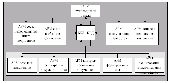 Например, для функций, выполняемых в отделе СДОУ можно выделить следующие типы АРМ (рис. 8): менеджера офиса, для составления документов, планирования труда в офисе, контроля исполнения поручений, приема-передачи информации, регистрации, распределения, формирования дел, сканирования документов и перевода их из бумажного вида в электронный, база электронных (БЭД) и бумажных документов (ББД). ИС можно классифицировать по нескольким признакам. По уровню управления, который занимает та экономическая система, для которой она разрабатывается: государственный уровень, уровень министерств и ведомств, ИС объединений и отдельных предприятий и по отраслям народного хозяйства (машиностроение, торговля, сельское хозяйство, сфера услуг т.д.). По территориальному разнесению подразделений, входящих в состав экономической системы, а, следовательно по технической реализации ИС и формам ее организационной структуры можно выделить централизованные и децентрализованные системы (с удаленной обработкой данных), локальные и распределенные системы, основными компонентами которой являются автоматизированные рабочие места. По степени сложности или по масштабу ИС можно разделить на несколько классов: · Однопользовательские настольные ИС (personal) – системы на одногоспециалиста, объединяющие на одном автоматизированном рабочем месте несколько управленческих функций или задач и располагающие локальной базой данных или совокупностью локальных файлов. Единицей обработки в таких системах является задача, а техническим обеспечением отдельная ЭВМ.
