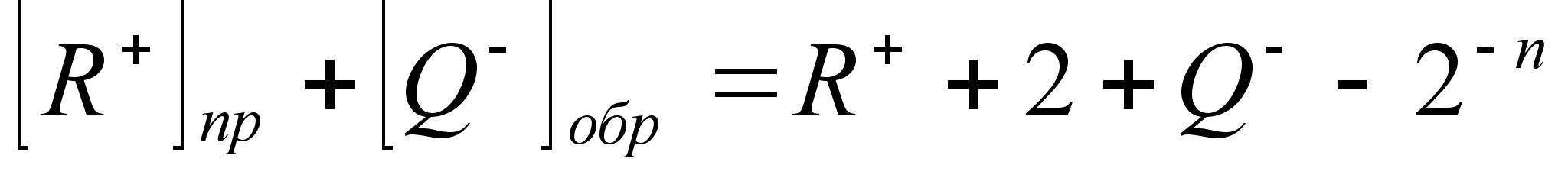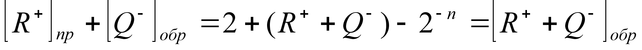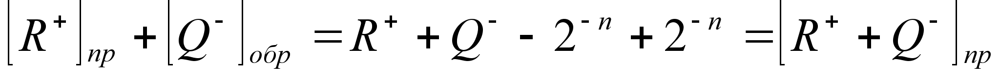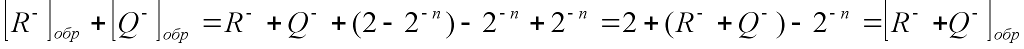 Из приведенных примеров следует, что положительные числа в прямом, обратном и дополнительном кодах совпадают. В прямом и обратном коде нуль имеет два представления – «положительный» и «отрицательный» нуль. В дополнительном коде нуль имеет только одно, «положительное», представление. Отметим, что при представлении с плавающей запятой отдельно кодируется мантисса и порядок числа. При этом возможно представление мантисс и порядков чисел в одном и том же или разных кодах. Например, порядок числа может быть представлен в прямом, а мантисса – в дополнительном кодах и т. п. Таким образом, используя обратный и дополнительный коды, операцию алгебраического сложения можно свести к арифметическому сложению кодов чисел, которое распространяется и на разряды знаков, которые рассматриваются как разряды целой части числа. Рассмотрим сначала использование обратного кода для алгебраического сложения n – разрядных двоичных чисел R и Q , когда оба они или одно из них отрицательно. Будем считать, что модуль их алгебраической суммы меньше единицы и единица переноса из разряда знака прибавляется к младшему разряду получившейся суммы. Пусть,