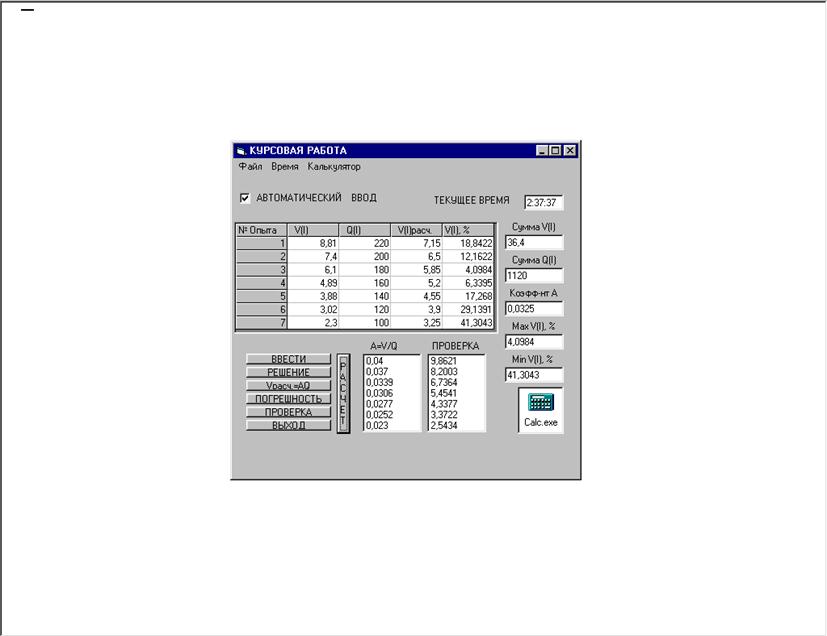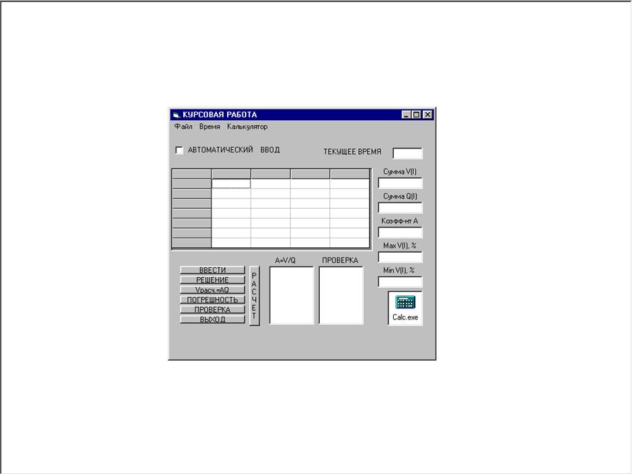Private Sub ×àñû1_Timer() 'ÂÛÂÎÄ ÂÐÅÌÅÍÈ Òåêñò5.Text = CStr(Time) End Sub Çíà÷åíèÿ ñâîéñòâ îáúåêòîâ: VERSION 5.00 Object = "{5E9E78A0-531B-11CF-91F6-C2863C385E30}#1.0#0"; "MSFLXGRD.OCX" Begin VB.Form Ôîðìà1 Caption = "ÊÓÐÑÎÂÀß ÐÀÁÎÒÀ" ClientHeight = 4905 ClientLeft = 165 ClientTop = 735 ClientWidth = 6660 LinkTopic = "Form1" ScaleHeight = 4905 ScaleWidth = 6660 StartUpPosition = 3 'Windows Default Begin VB.ListBox Ñïèñîê2 Height = 1425 ItemData = "ÊÓÐÑÎÂÀß ÐÀÁÎÒÀ.frx":0000 Left = 3600 List = "ÊÓÐÑÎÂÀß ÐÀÁÎÒÀ.frx":0002 TabIndex = 16 Top = 3240 Width = 1095 End Begin VB.ListBox Ñïèñîê1 Height = 1425 ItemData = "ÊÓÐÑÎÂÀß ÐÀÁÎÒÀ.frx":0004 Left = 2400 List = "ÊÓÐÑÎÂÀß ÐÀÁÎÒÀ.frx":0006 TabIndex = 15 Top = 3240 Width = 1095 End Begin VB.TextBox Òåêñò6 Height = 285 Left = 5040 TabIndex = 14 Top = 3480 Width = 1095 End Begin VB.TextBox Òåêñò5 Height = 285 Left = 5280 TabIndex = 13 Top = 360 Width = 855 End Begin VB.TextBox Òåêñò 4 Height = 285 Left = 5040 TabIndex = 12 Top = 2880 Width = 1095 End Begin VB.TextBox Òåêñò 3 Height = 285 Left = 5040 TabIndex = 11 Top = 2280 Width = 1095 End Begin VB.TextBox Òåêñò 2 Height = 285 Left = 5040 TabIndex = 10 Top = 1680 Width = 1095 End Begin VB.TextBox Òåêñò 1 Height = 285 Left = 5040 TabIndex = 9 Top = 1080 Width = 1095 End Begin VB.Timer ×àñû1 Interval = 250 Left = 4800 Top = 3840 End Begin VB.CommandButton Êîììàíäà6 Caption = "ÂÛÕÎÄ" Height = 195 Left = 240 TabIndex = 7 Top = 4440 Width = 1575 End Begin VB.CommandButton Êîììàíäà 5 Caption = "ÏÐÎÂÅÐÊÀ" Height = 195 Left = 240 TabIndex = 6 Top = 4200 Width = 1575 End Begin VB.CommandButton Êîììàíäà 4 Caption = "ÏÎÃÐÅØÍÎÑÒÜ" Height = 195 Left = 240 TabIndex = 5 Top = 3960 Width = 1575 End Begin VB.CommandButton Êîììàíäà 3 Caption = "Vðàñ÷.=AQ" Height = 195 Left = 240 TabIndex = 4 Top = 3720 Width = 1575 End Begin VB.CommandButton Êîììàíäà 2 Caption = "ÐÅØÅÍÈÅ" Height = 195 Left = 240 TabIndex = 3 Top = 3480 Width = 1575 End Begin VB.CommandButton Êîììàíäà 1 Caption = "ÂÂÅÑÒÈ" Height = 195 Left = 240 TabIndex = 2 Top = 3240 Width = 1575 End Begin VB.CheckBox Ïðîâåðêà1 Caption = " ÀÂÒÎÌÀÒÈ×ÅÑÊÈÉ ÂÂÎÄ" Height = 375 Left = 120 TabIndex = 1 Top = 240 Width = 2775 End Begin MSFlexGridLib.MSFlexGrid MSFlexGrid1 Height = 2055 Left = 0 TabIndex = 0 Top = 840 Width = 4935 _ExtentX = 8705 _ExtentY = 3625 _Version = 393216 Rows = 8 Cols = 5 End Begin VB.OLE OLE1 Class = "Package" Height = 495 Left = 5280 OleObjectBlob = "ÊÓÐÑÎÂÀß ÐÀÁÎÒÀ.frx":0008 SourceDoc = "C:\WINDOWS\CALC.EXE" TabIndex = 24 Top = 3840 Width = 855 End Begin VB.Label Ìåòêà8 Caption = " ÏÐÎÂÅÐÊÀ" Height = 255 Left = 3600 TabIndex = 23 Top = 3000 Width = 1095 End Begin VB.Label Ìåòêà 7 Caption = " A=V/Q" Height = 255 Left = 2280 TabIndex = 22 Top = 3000 Width = 1095 End Begin VB.Label Ìåòêà 6 Caption = " Max V(I), %" Height = 255 Left = 5040 TabIndex = 21 Top = 2640 Width = 1095 End Begin VB.Label Ìåòêà 5 Caption = " Min V(I), %" Height = 255 Left = 5040 TabIndex = 20 Top = 3240 Width = 1095 End Begin VB.Label Ìåòêà 4 Caption = " Êîýôô-íò À" Height = 255 Left = 5040 TabIndex = 19 Top = 2040 Width = 1095 End Begin VB.Label Ìåòêà 3 Caption = " Ñóììà Q(I)" Height = 255 Left = 5040 TabIndex = 18 Top = 1440 Width = 1095 End Begin VB.Label Ìåòêà 2 Caption = " Ñóììà V(I)" Height = 255 Left = 5040 TabIndex = 17 Top = 840 Width = 1095 End Begin VB.Label Ìåòêà 1 Caption = "ÒÅÊÓÙÅÅ ÂÐÅÌß" Height = 255 Left = 3720 TabIndex = 8 Top = 360 Width = 1575 End Begin VB.Menu mnuÔàéë Caption = "Ôàéë" Begin VB.Menu mnuÎòêðûòü Caption = "Îòêðûòü" End Begin VB.Menu mnuÂûõîä Caption = "Âûõîä" End End Begin VB.Menu mnuÂðåìÿ Caption = "Âðåìÿ" Begin VB.Menu mnuÏîêàçàòü Caption = "Ïîêàçàòü" End Begin VB.Menu mnuÑêðûòü Caption = "Ñêðûòü" End End Begin VB.Menu mnuÊàëüêóëÿòîð Caption = "Êàëüêóëÿòîð" Begin VB.Menu mnuÂêëþ÷èòü Caption = "Âêëþ÷èòü" End End End Attribute VB_Name = "Ôîðìà1" Attribute VB_GlobalNameSpace = False Attribute VB_Creatable = False Attribute VB_PredeclaredId = True Attribute VB_Exposed = False Ðàáî÷àÿ ôîðìà ñ äàííûìè: