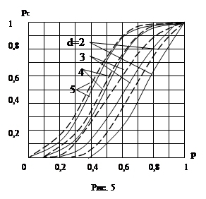 На рис. 5,6 представлены зависимости (11) для n=6, и d=2…..7 (штриховые линии). Сравнение кривых показывает, что верхнюю границу вероятности связности сети, особенно при больших d. Таким образом, полученная простая верхняя оценка вероятности связности равнопрочных сетей связи дает шорошее приближение к точному значению вероятности связности сети при больших значениях d. |