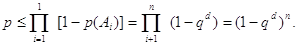 Расчетные формулы для рс при d=5 и 6 из-за громоздкости не приводятся. На рис 5 и 6 представлены зависимости вероятности связности сети с n=6, 8 соответственно при различных d (сплошные линии), построенные по формулам (5) – (10). Из рисунков видно, что увеличение вероятности связности сети с увеличением d при неизменном p объясняется тем , что с увеличением d возрастает разветвленность сети связи. К сожалению, ловольно трудно получить аналитическое выражение для вероятности связности сети рассматренного семейство графов при различных d и n, за исключением полносвязных сетей с d = n – 1 [см.выражение (1) – (4)]. По этому целесобразно определять верхнюю груницу вероятности связности графов. Если граф связный, то в нем не может быть изолированных вершин. В этом случае каждой вершине должна быть инцидента по крайней мере одна ветвь. Пусть Ai – событие, когда не существует неповрежденных ветвей, инцидентных вершине i, p(Ai) – вероятность этого события; 1 – p(Ai) – вероятность дополнительного события, когда существует по крайней мере одна целая ветвь, инцидентная вершине i, Поэтому вероятность того, что у всех вершин есть по крайне мере одна целая ветвь, т.е. есть связана, ограничена неравенством: