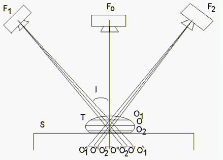 Рис.1 Принцип образования послойного изображения. F0, F1, F2 -нулевое,исходное и конечное положение фокуса рентгеновской трубки; j-1/2 угла поворота трубки; S-поверхность стола; Т-объект исследования; О-точка выделяемого слоя; О1, О2-точки, находящиеся выше и ниже выделяемого слоя; О`, О``-проекции точки О на пленке при исходном и конечном положениях фокуса рентгеновской трубки; О1`, O1``-проекции точки О1 на пленке при тех же положениях фокуса трубки; О2`, О2``-проекции точки О2 при тех же положениях фокуса трубки; О```-проекции всех точек на пленке при нулевом положении рентгеновской трубки. неподвижном объекте исследования. Рентгеновский излучатель и кассето-держатель с приемником излучения (рентгеновская пленка, селеновая пластина) соединяют жестко с помощью металлического рычага. Ось вращения рычага (перемещения трубки и пленки) находится над уровнем стола и ее можно произвольно перемещать. Как показано на рис.1, при перемещении трубки из положения F1 в положение F2, проекция точки О, которая соответствует оси вращения рычага, будет постоянно находиться в одном и том же месте пленки. Проекция точки О неподвижна относительно пленки и, следовательно, ее изображение будет четким. Проекции точек О1 и О2,находящиеся вне выделяемого слоя, с перемещением трубки и пленки меняют свое положение на пленке и, следовательно, их изображение будет нечетким, размазанным. Доказано, что геометрическим местом точек, проекции которых при движении системы неподвижны относительно пленки, является плоскость, параллельная плоскости пленки и проходящая через ось окончания системы. На томограмме, таким образом, будут четкими изображения всех точек, находящихся в плоскости на уровне оси вращения системы, то есть в выделяемом томографическом слое. На рисунке показано перемещение трубки и пленки по траектории прямая-прямая, то есть по параллельным прямолинейным направляющим. Такие томографы, имеющие самую простую конструкцию, получили наибольшее распространение. В томографах с траекториями дуга-дуга, дуга-прямая геометрическим местом точек, проекции которых при движении системы неподвижны относительно пленки, является плоскость, параллельные плос-кости пленки и проходящая через ось качания системы; выделяется слой также плоской формы. Из-за более сложной конструкции эти томографы получили меньшее распространение. Описанные выше аппараты относятся к линейным томографам (с линейными траекториями), так как проекции траекторий движения системы трубка-пленка на выделяемую плоскость имеют вид прямой линии, а тени размазывания имеют прямолинейную форму. За угол поворота (качания) трубки 2j в таких томографах принимают угол ее поворота из одного крайнего положения в другое; перемещение трубки от нулевого положения равно j. В томографах с нелинейным размазыванием перемещение системы трубка - пленка происходит по криволинейным траекториям - кругу, эллипсу, гипоциклоиде, спирали. При этом отношение расстояний фокус трубки - центр вращения и центр вращения - пленка сохраняется постоянным. И в этих случаях доказано, что геометрическим местом точек, проекции которых при движении системы неподвижны относительно пленки, является плоскость, параллельная плоскости пленки и проходящая через ось качания системы. Размазывание изображения точек объекта, лежащих вне выделя