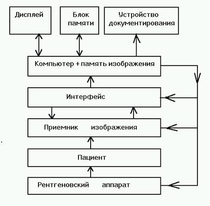 Рис.2 Составные элементы цифровой системы получения рентгеновских изображений В цифровой рентгенологии могут найти применение два класса приемников изображения: приемники с непосредственным формированием изображения и приемники с частичной регистрацией изображения, в которых полное изображение формируется путем сканирования либо рентгеновским пучком, либо приемным устройством (сканирующая проекционная рентгенография). В цифровой рентгенографии применяют усилитель изображения, ионографическую камеру и устройство с вынужденной люминисценцией. Эти приемники могут непосредственно формировать цифровые изображения без промежуточной регистрации и хранения. Усилители изображения не обладают наилучшим пространственным разрешением или контрастом, однако имеют высокое быстродействие. Аналого-цифровое преобразование флюорограммы с числом точек в изображении 512х512 может занимать время менее 0,03 с. Даже при числе точек 2048х2048 в изображении время преобразования изображения в цифровую форму составляет всего несколько секунд. Время считывания изображения с пластины с вынужденной люминисценции или ионографической камеры значительно больше, хотя последнее выгодно отли-чается лучшим разрешением и динамическим диапазоном. Записанное на фотопленке изображение можно преобразовать в цифровую форму с помощью сканирующего микроденситометра, но любая информация, зафиксированная на фотопленке со слишком малой или, наоборот, слишком высокой оптической плотностью, будет искажена из-за влияния характеристик пленки. В цифровую форму можно преобразовать и ксеро-рентгенограмму также с помощью сканирующего денситометра, работающего в отраженном свете, или путем непосредственного считывания зарядового изображения с селеновой пластины. [№ 5, стр. 99-100] В России прямая цифровая рентгенографическая система Института ядерной физики (ИЯФ) СО РАН применяется в нескольких клинических больницах. В этой системе рентгеновская пленка как регистратор рентгеновского излучения заменена многопроволочной пропорциональной камерой. Такая камера вместе с электронными схемами усиления и формирования импульсов представляет собой линейку на 256 практически независимых каналов, имеющих чувствительную поверхность 1х1 мм. (В последних моделях 350 каналов и 0,5х0,5 мм.) Использование в счетчиках в качестве рабочего газа ксенона при давлении 3 кгс/см2 обеспечивает высокую эффективность регистрации излучения. Эта система может быть отнесена к классу ионографических приборов для цифровой рентгенографии, передающих изображение на внешние устройства отображения. В других цифровых рентгенографических системах используют твердотельные приемники с высоким коэффициентом поглощения рентгеновского излучения. В обоих разновидностях упомянутых рентгенографических систем применяется метод сканирования с построчной регистрацией изображения, которое воспроизводится в целое на дисплее компьютера (сканирующая проекционная рентгенография). Ко второму классу цифровых рентгенографических систем следует отнести люминофоры с памятью и вынужденной люминесценцией, которая затем регистрируется. Это приемник с непосредственным формированием изображения. [№ 6] Системы получения изображения со сканированием рентгеновским пучком и приемником имеют важное пр