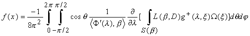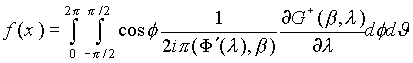 при этом l , зависящее от b и x, остается фиксированным. Как и выше, b = b (q , j ) = (cosq cosj , cosq sinj , sinq ), l = l (q , j ) = l (x, b ) такое, что скалярное произведение (x, b ) равно (b , g (l )) и (b , g /(l )). В формуле (4) используются регулярные функции, и она пригодна для построения численных алгоритмов. Замечание. А.С. Денисюком независимо и другим методом, без явного использования преобразования Фурье обобщенных функций, получены формулы обращения функции g+ в Rn . При n = 3 формулы А.С. Денисюка и формулы, получаемые изложенным способом из формулы Туя, совпадают. Выше были получены формулы, позволяющие строить численные алгоритмы восстановления функции f(x) = f(x1, x2, x3) по ее лучевому преобразованию