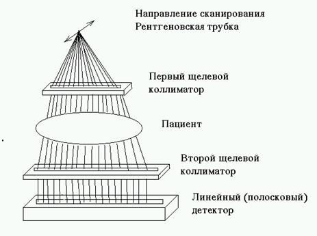 Рис.3 Система линейного сканирования для цифровой рентгенографии грудной клетки. Матрицы изображения из 512х512 элементов может быть вполне достаточно для целей цифровой флюороскопии (флюорографии), тогда как система рентгеноскопии грудной клетки может потребовать матрицы с числом элементов 1024х1024 при размерах элемента изображения 0,4 мм. Число градаций в изображении зависит от медицинского назначения. Аналого-цифрового преобразования на 8 бит, обеспечивающего точность 0,4%, вполне достаточно для регистрации зашумленных изображений или больших массивов (меньшей ступени градации яркости соответствует больший уровень шума), однако для ряда приложений может понадобиться и 10-битовый АЦП (точность 0,1%). Если требуется быстрый доступ к информации, полученной за длительный период времени, целесообразно применять оптические диски. Емкость памяти 12-дюймового оптического диска равна примерно 2 гигабайт, что соответствует 1900 изображениям размером 1024х1024 по 8 бит каждое (без сжатия данных). Для считывания с оптического диска может быть использовано автоматическое устройство съема, позволяющее обеспечить быстрый доступ к любому изображению. Возможность работы со всеми изображениями в цифровой форме весьма привлекательна, а системы, выполняющие это, называются системами хранения и передачи изображения (СПХИ или СХПИ). [№ 5, стр. 100-102]