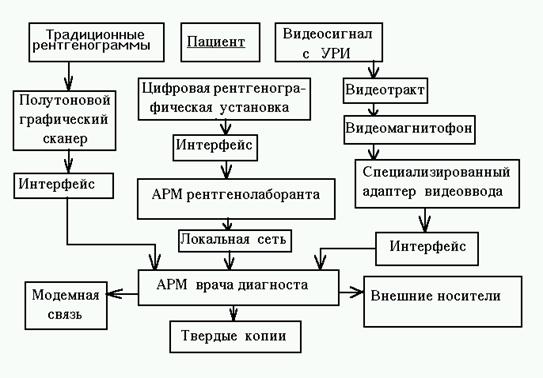 Рис.5 Принципиальная схема взаимодействия элементов системы получения, обработки, хранения и передачи рентгеновских диагностических изображений. На рис.5 изображена принципиальная схема взаимодействия элементов системы получения, обработки, хранения и передачи рентгеновских диагностических изображений. Система представлена тремя каналами: 1) традиционная рентгенография; 2) цифровая рентгенографическая установка; 3) рентгеноскопия (видеосигнал с УРИ). Первый канал. Рентгенограммы, полученные с помощью традиционного процесса, поступают на обработку в полутоновый графический сканер, с помощью которого рентгенодиагностическое изображение вводится в память компьютера. После этого такая преобразованная рентгенограмма может обрабатываться средствами компьютерной техники, но в рамках узкого динамического диапазона рентгеновской пленки. Это изображение может быть введено в электронный архив и извлекаться оттуда по требованию. Эта оцифрованная рентгенограмма уже ничем не отличается от прямых цифровых рентгенограмм по доступности средствам обработки. Третий канал. Рентгеновские изображения из рентгенотелевизионного канала УРИ могут захватываться специализированным адаптером видеоввода как в режиме реального времени, так и с видеомагнитофонного кадра. Последнее предпочтительно, так как позволяет при просмотре видеомагнитофонных изображений выбрать нужный кадр для занесения его в архив. Объектом ввода в электронный архив могут быть любые изображения, получаемые при рентгеноскопии с помощью УРИ. Первый и третий каналы дают возможность преобразовать традиционные рентгеновские изображения (рентгенограммы и кадры видеотелевизионного тракта) в цифровое изображение. Этот прием имеет особое значение, потому что он представляет возможность достоверно сравнить изображения, полученные различными способами. Следующим преимуществом преобразования являются возможность помещения его в электронный архив и выполнение всех операций с цифровым изображением. Следует особенно подчеркнуть возможность передачи изображения по компьютерным сетям, потому что в последние годы «взгляды медиков фокусируются на передаче изображений» как основном средстве обеспечения доступа к материалам, что имеет колоссальное значение как для диагностики, так и для процессов обучения. Второй канал. Это собственно канал цифровой рентгенографической установки. Он состоит из двух подсистем: автоматизированного рабочего места (АРМ) лаборанта и АРМ врача-рентгенолога (ВР), объединенных в локальную сеть. В АРМ рентгенолаборанта происходит внесение сведений о больном, необходимых организационных и клинических данных и управление процессом регистрации изображения (синхронное включение сканера и высокого напряжения и др.). После получения рентгеновского изображения оно и сведения о пациенте по локальной сети поступают в АРМ ВР. При этом процесс рентгенографии и передачи изображений от АРМ лаборанта в АРМ врача происходит без промедлений и в реальном времени, не прерывая работы врача ни на одной ступени, т.е. происходит непрерывная и независимая работа на обоих рабочих местах. На АРМ ВР выполняются программная обработка изображений для извлечения диагностической информации, поиск предшествующих изображений пациентов и сравнение с вновь 