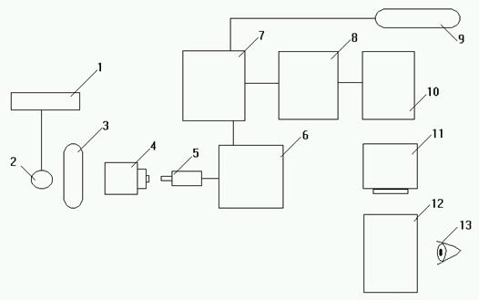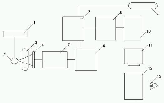 Рис.5 Цифровая селеновая рентгенография. 1-генератор; 2-рентгеновская трубка; 3-пациент; 4-селеновый барабан; 5-сканирующие электроды+усилитель; 6-аналого-цифровой преобразо- ватель; 7-накопитель изображений; 8-видеопроцессор; 9-сеть; 10-цифро-аналоговый преобразователь; 11-монитор; 12-снимок; 13-рентгенолог.