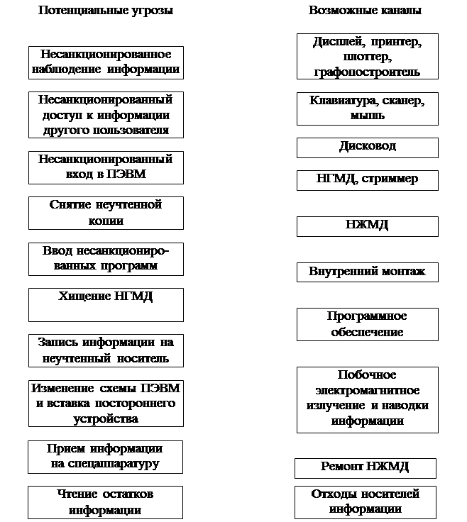 Рисунок Д.3 - Возможные каналы НСД к информации ПЭВМ и потенциальные угрозы |
