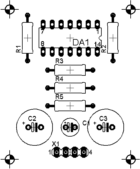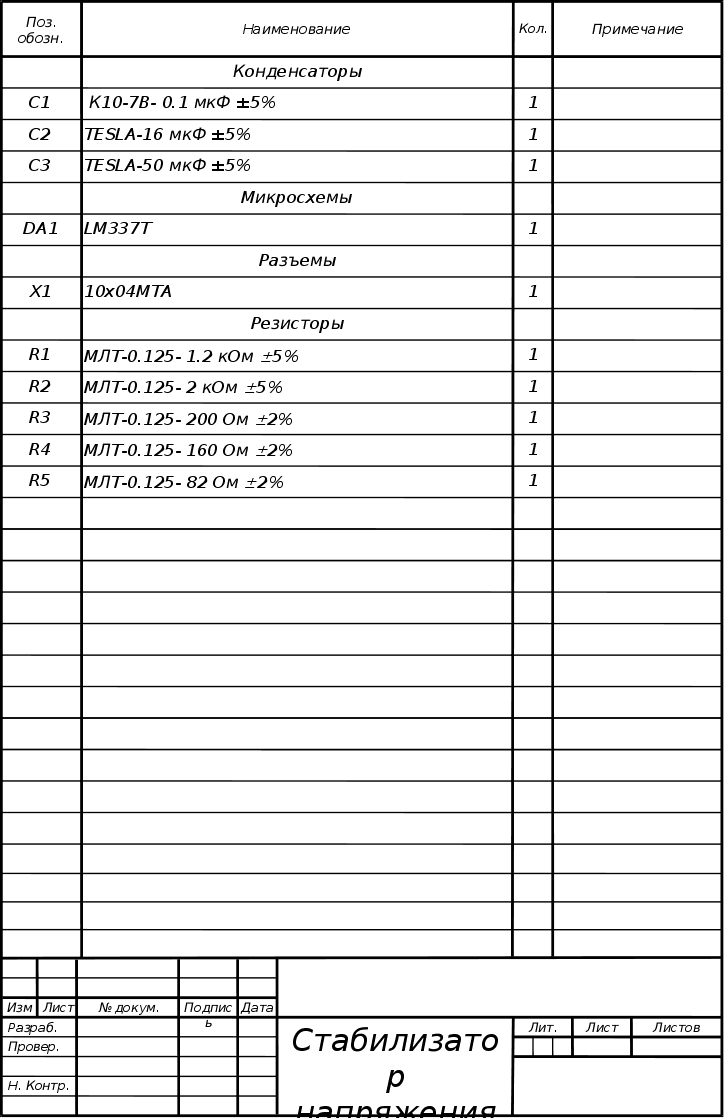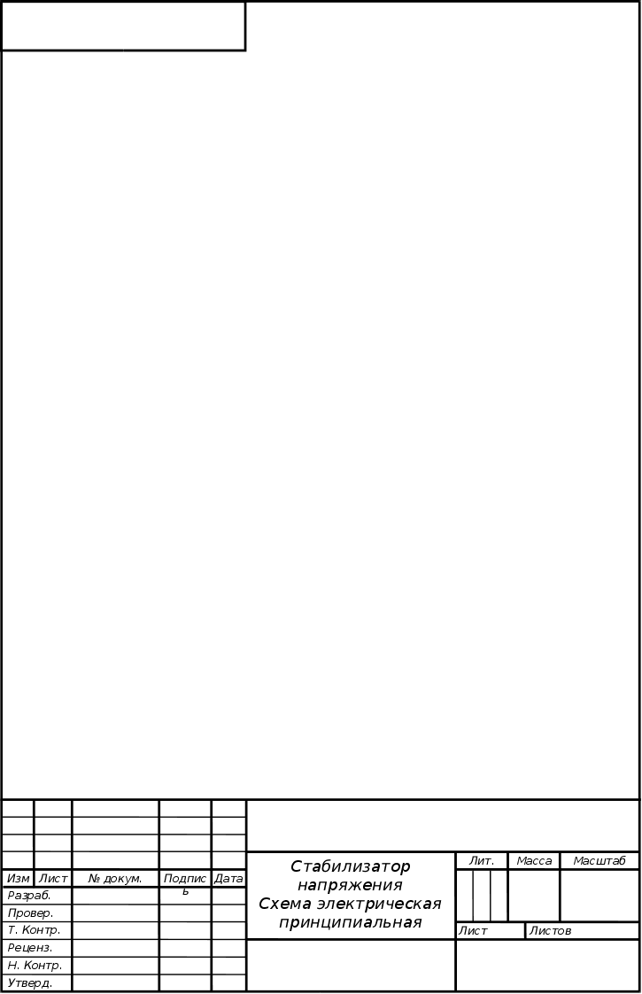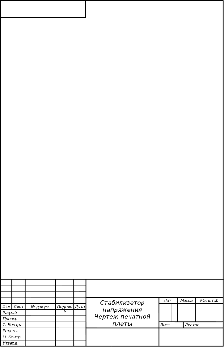 В данной курсовой работе была рассмотрена методика разработки электронных устройств на стабилизатора напряжения на интегральной микросхеме, рассмотрены основные условия стабилизации напряжения и методы их реализации. Согласно техническому заданию была выбрана и рассчитана схема стабилизатора напряжения. В результате проделанной работы была создана следующая документация: - пояснительная записка; - схема электрическая принципиальная и перечень элементов стабилизатора напряжения; - чертёж печатной платы и компоновочный эскиз; - схема испытаний устройства. Данный стабилизатор может применяться в составе постоянных источников питания радиоаппаратуры. СПИСОК ЛИТЕРАТУРЫ 1. Борисов В.Г. Кружок радиотехнического конструирования: Пособие для руководителей кружков. — М.: Просвещение, 1986. 2. Забродин Ю.С. Промышленная электроника. 3. Терещук Р.М., Терещук К.М. Полупроводниковые приемно-усилительные устройства: справочник радиолюбителя. — Киев: Наукова думка, 1988. 4. Полупроводниковые приборы: транзисторы, справочник под ред. Горюнова Н.Н. М.: Энергоатомиздат, 1983.