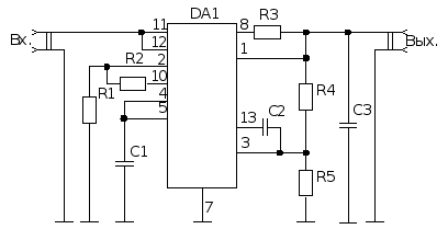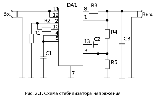 Поскольку ток IБ макс транзистора VT1 является током нагрузки простейшего стабилизатора, состоящего из резистора R1 и стабилитрона VD, то по его значению находят сопротивление резистора R1 по условию: (Uвх.макс-Uст.мин)/Iст.мах≤R1≤(Uвх.мин-Uст.мин)/ (Iст.мин-IБ.макс) Сопротивление резистора R2 можно определить по формуле: R2= Uвых/Iн*(0,05...0,1). Для нормальной работы стабилизатора требуется, чтобы напряжение на переходе коллектор—эмиттер транзистора VT1 было не менее 1 В, если транзистор VT1 германиевый, и не менее 3 В — если кремниевый. Cложность построения рассмотренных стабилизаторов возрастает с увеличением требований к параметрам выходного напряжения. Задача конструирования высококачественных стабилизаторов напряжения значительно упрощается, если использовать интегральные стабилизаторы. Эти стабилизаторы отличаются малыми размерами и в то же время позволяют получить стабильные параметры выходного напряжения, малочувствительные к изменениям температуры, влажности и другим внешним воздействиям. Примером интегрального стабилизатора напряжения, получившего широкое распространение в радиолюбительской практике, является микросхема серии 142, имеющая множество разновидностей. ИМС этой серии позволяют получать фиксированное выходное напряжение, имеют защиту от перегрузок по току, выпускаются в металлополимерных корпусах, могут работать при температурах от -45 до +100°С и весят всего 2,5 г. У них всего три вывода—вход, выход и общий. Корпус микросхемы соединен с металлической пластинкой, в которой имеется отверстие для крепления на терморассеивающем радиаторе. Несмотря на наличие всего трех выводов, в миниатюрном кристалле этих микросхем выполнено более 17 биполярных транзисторов, 3 диода, два из которых являются стабилитронами, 19 резисторов и 1 конденсатор. 2. Описание электрической схемы выбранного устройства В результате анализа технического задания было выяснено, что получить требуемые параметры, используя типовые схемы стабилизаторов не возможно, вследствие сложности проектирования: большое количество каскадов (больше 10) и большое количество элементов обвязки. Расчет такого стабилизатора также будет затруднен необходимостью подбора радиоэлементов по параметрам и согласование каскадов. Оптимальным решением в данном случае будет применение интегрального стабилизатора напряжения. Такие стабилизаторы содержат большое количество транзисторов (больше 10) , подобранных по параметрам, каскады включения согласованы. Не маловажным фактором является и то, что основные каскады стабилизации содержаться в одном корпусе. Это обеспечивает термостабильность (работу стабилизатора при температурах -40С до +100С). На рис. 2.1 приведена типовая схема включения стабилизатора с обвязкой, необходимой для работы микросхемы.