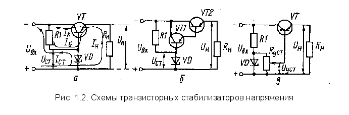 Для простейшего стабилизатора RВЫХ= rд.ст. Рассмотренный стабилизатор напряжения на кремниевом стабилитроне имеет простое устройство, малое количество деталей и с успехом может применяться тогда, когда ток нагрузки не превышает среднего значения тока, протекающего через стабилитрон и находящегося в пределах между IСТ.МИН и IСТ.МАКС. При использовании стабилитронов типа Д808...Д814 ток нагрузки не должен превышать 20...30 мА. При больших токах нагрузки необходимы более мощные стабилитроны. Недостатком простейшего стабилизатора на кремниевом стабилитроне является потеря части напряжения на ограничительном резисторе R1, что приводит к снижению КПД стабилизатора. Кроме того, у этого стабилизатора сравнительно небольшой коэффициент стабилизации и значительное выходное сопротивление. Поэтому во всех случаях, когда требуется получить стабилизированное напряжение на нагрузке при большом токе, протекающем через нее, применяют транзисторные стабилизаторы напряжения. В качестве такового без существенного увеличения числа элементов и усложнения схемы используют транзисторный фильтр со своеобразной следящей системой, которая в зависимости от изменения напряжения на входе фильтра или на его выходе за счет изменения тока нагрузки изменяет сопротивление транзистора таким образом, что напряжение на выходе этого фильтра — стабилизатора остается неизменным.