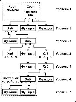 Интерфейс USB соединяет между собой хост (host) и устройства. Хост находится внутри персонального компьютера и управляет работой всего интерфейса. Для того, чтобы к одному порту USB можно было подключать более одного устройства, применяются хабы (hub - устройство, обеспечивающее подключение к интерфейсу других устройств). Корневой хаб (root hub) находится внутри компьютера и подключен непосредственно к хосту. В интерфейсе USB используется специальный термин "функция" - это логически законченное устройств, выполняющее какую-либо специфическую функцию. Топология интерфейса USB представляет собой набор из 7 уровней (tier): на первом уровне находится хост и корневой хаб, а на последнем - только функции. Устройство, в состав которого входит хаб и одна или несколько функций, называется составным (compaund device). Порт хаба или функции, подключаемый к хабу более высокого уровня, называется восходящим портом (upstream port), а порт хаба, подключаемый к хабу более низкого уровня или к функции называется нисходящим портом (downstream port). Все передачи данных по интерфейсу иницируются хостом. Данные передаются в виде пакетов. В интерфейсе USB испольуется несколько разновидностей пакетов: пакет-признак (token paket) описывает тип и направление передачи данных, адрес устройства и порядковый номер конечной точки (КТ - адресуемая часть USB-устройства); пакет-признаки бывают нескольких типов: IN, OUT, SOF, SETUP; пакет с данными (data packet) содержит передаваемые данные; пакет согласования (handshake packet) предназначен для сообщения о результатах пересылки данных; пакеты согасования бывают нескольких типов: ACK, NAK, STALL. Таким образом каждая транзакция состоит из трех фаз: фаза передачи пакета-признака, фаза передачи данных и фаза согласования. В интерфейсе USB используются несколько типов пересылок информации. Управляющая пересылка (control transfer) используется для конфигурации устройства, а также для других специфических для конкретного устройства целей. Потоковая пересылка (bulk transfer) используется для передачи относительно большого объема информации. Пересылка с прерыванием (iterrupt transfer) испольуется для передачи относительно небольшого объема информации, для которого важна своевременная его пересылка. Имеет ограниченную длительность и повышенный приоритет относительно других типов пересылок. Изохронная пересылка (isochronous transfer) также называется потоковой пересылкой реального времени. Информация, передаваемая в такой пересылке, требует реального масштаба времени при ее создании, пересылке и приеме. Потоковые пересылки характеризуются гарантированной безошибочной передачей данных между хостом и функцией посредством обнаружения ошибок при передаче и повторного запроса информации. Когда хост становится готовым принимать данные от функции, он в фазе передачи пакета-признака посылает функции IN-пакет. В ответ на это функция в фазе передачи данных передает хосту пакет с данными или, если она не может сделать этого, передает NAK- или STALL-пакет. NAK-пакет сообщает о временной неготовности функции передавать данные, а STALL-пакет сообщает о необходимости вмешательства хоста. Если хост успешно получил данные, то он в фазе согласования посылает функции ACK-пакет. В противном случае транзакция завершается. Когда хост становится готовым передавать данные, он посылает функции OUT-пакет, сопровождаемый пакетом с данными. Е