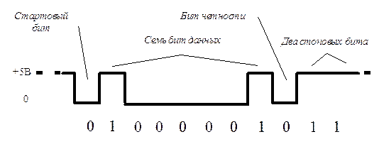 Рис. 2. Представление кода буквы А сигнальными уровнями ТТЛ. Таким образом, полное асинхронно передаваемое слово состоит из 11 бит (фактически данные содержат только 7 бит) и записывается в виде 01000001011. Используемые в интерфейсе RS-232C уровни сигналов отличаются от уровней сигналов, действующих в компьютере. Логический 0 (SPACE) представляется положительным напряжением в диапазоне от +3 до +25 В, логическая 1 (MARK) - отрицательным напряжением в диапазоне от -3 до -25 В. На рис. 3 показан сигнал в том виде, в каком он существует на линиях TXD и RXD интерфейса RS-232C.