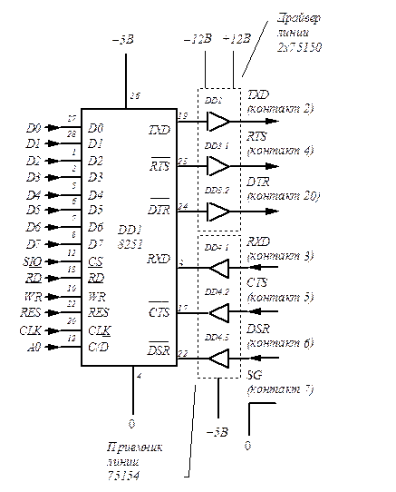 Рис. 3. Вид кода буквы А на сигнальных линиях TXD и RXD. Сдвиг уровня, т.е. преобразование ТТЛ-уровней в уровни интерфейса RS-232C и наоборот производится специальными микросхемами драйвера линии и приемника линии. На рис. 4 представлен типичный микрокомпьютерный интерфейс RS-232C. Программируемая микросхема DD1 последовательного ввода осуществляет параллельно-последовательные и последовательно-параллельные преобразования данных. Микросхемы DD2 и DD3 производят сдвиг уровней для трех выходных сигналов TXD, RTS, DTR, а микросхема DD4 - для трех входных сигналов RXD, CTS, DSR. Микросхемы DD2 и DD3 требуют напряжения питания ±12 В.