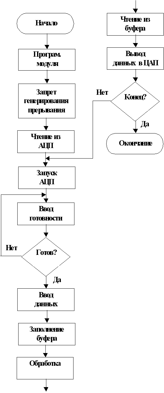 IN DX, AL 5. ПРОГРАММНОЕ ОБЕСПЕЧЕНИЕ. При работе модуля обмен может быть реализован по желанию пользователя по прерыванию либо с неготовностью. Блок – схема работы программного обеспечения представлена на рисунке 5.1. (обмен по прерыванию) и на рисунке 5.3. (обмен с неготовностью). На рисунке 5.2. представлена блок – схема обработчика прерывания.