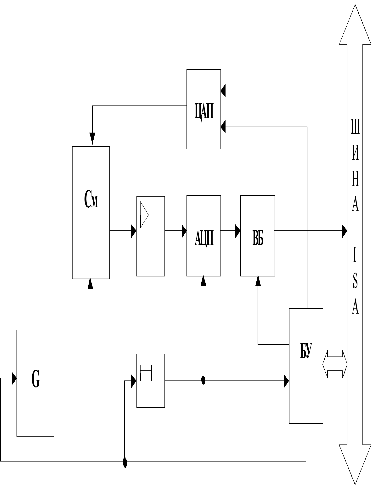 Преобразователь, содержащий один канал, обеспечивает считывание мгновенных значений входных сигналов и преобразование их в цифровой код. С приходом на вход устройства сигнала запуска от блока управления генератор стробирующих импульсов формирует короткие импульсы, под действием которых кратковременно открываются быстродействующие ключевые схемы стробоскопических смесителей и на входных емкостях усилителей происходит запоминание мгновенных значений напряжений исследуемых сигналов. Усиленный сигнал с выхода стробоскопического смесителя непосредственно преобразуется в цифровой код с помощью быстродействующего параллельного аналого – цифрового преобразователя АЦП и через схему выходного буферного устройства ВБ поступает на ЭВМ. Элемент задержки сигнала запуска АЦП включен с целью устранения влияния переходных процессов установления выходных сигналов в стробоскопичесом смесителе. В рассматриваемом стробоскопическом АЦП используется структура с обратной связью, реализующая компенсационный принцип измерения. Компенсирующее напряжение подается на схему стробоскопического смесителя СМ с цифроаналоговым преобразователем ЦАП. Сигнал на выходе стробоскопического смесителя пропорционален разности входного и компенсирующего напряжения. Обратная связь позволяет существенно повысить линейность преобразования, снизить требования к числу разрядов АЦП. Достигается также высокая верность воспроизведения сигналов, поскольку компенсирующее напряжение в момент стробирования практически равно входному и схема смесителя не нагружает источник входного сигнала. Обратная связь в системе, осуществляемая через ЭВМ, позволяет использовать различные алгоритмы статистической обработки, проводить подстройку петлевого коэффициента передачи для получения оптимальной переходной характеристики. Взаимодействие стробоскопического преобразователя с ЭВМ осуществляется с помощью блока управления, обеспечивающего формирование сигналов для организации программного обмена и прерывания программы. При построении блока управления использованы стандартные для магистрали МПИ структуры логических узлов. Логическое устройство обеспечивает дешифрацию адресов регистров: запуска, чтения, записи и маскирования прерывания. В качестве сигнала запроса на прерывание ГОТОВО, поступающего на логическое устройство организации режима прерывания из преобразователя, используется сигнал запуска АЦП. Этот же сигнал устанавливает в состояние готовности седьмой разряд регистра состояния. В приложении приведена принципиальная схема канала стробоскопического АЦП с интерфейсной частью. Наиболее ответственным узлом преобразователя, определяющим его метрологические характеристики, является стробоскопический смеситель. С выхода усилителя DA1 выборка входного сигнала поступает на вход дополнительного быстродействующего усилителя К1420УД1. Применение повторителя на мощном полевом транзисторе VT1 необходимо для увеличения нагрузочной способности схемы. Преобразование амплитуды сигнала выборки в цифровой код осуществляется DD13 – схемой параллельного АЦП К1107ПВ3, позволяющего непосредственно измерять сигналы амплитудой до 2.5 В. Запуск АЦП осуществляется от формирователя импульсов на микросхеме DD14 . По фронту импульса происходит
