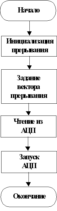 Рис 5.2. Блок – схема обработчика прерывания. 5.1. Запуск АЦП производится выдачей по адресу 14300h любых данных. С помощью данной команды формируется строб запуска АЦП. Чтение данных из модуля производится по адресу 14301h. При этом из порта считывается байт данных. Формат байта приведен в таблице 5.1. Таблица 5.1