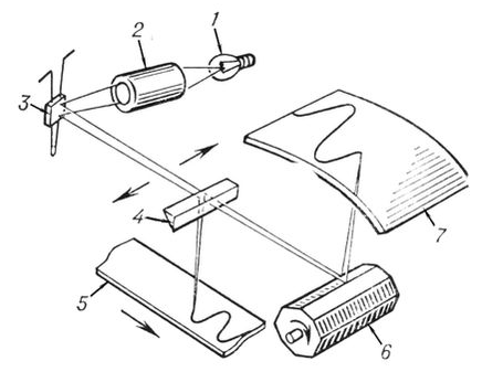 Рис2 Шлейфовый осциллограф (схема устройства) Ш. о. состоит (см. рис 2.) из одного или нескольких магнитоэлектрических зеркальных гальванометров (шлейфов) светооптической системы, блока протяжки (на рис. не показан), носителя записи (светочувствительной бумаги или фотоплёнки) и устройства визуального наблюдения. Светооптическая система формирует световой луч, фокусирует его и направляет на зеркало шлейфа. Отразившись от зеркала, луч попадает на светочувствительную плёнку (бумагу) и оставляет на ней след в виде кривой, отображающей изменение исследуемой физической величины во времени. Развёртка кривой во времени обеспечивается равномерным перемещением носителя записи в направлении, перпендикулярном отклонению светового луча. Скорость движения носителя записи у различных Ш. о. регулируется в пределах от 1 до 10 000 мм/сек. Для визуального наблюдения записываемой кривой служит сферический матовый экран, на который попадает часть светового луча, отражённого зеркалом шлейфа. Развёртка во времени визуально наблюдаемой кривой осуществляется с помощью равномерно вращающегося многогранного зеркального барабана. При вращении барабана луч света, отражаясь от его зеркальных граней, периодически пробегает по экрану. Регулируя частоту вращения барабана, можно добиться неподвижного изображения кривой. Для одновременной регистрации нескольких физических величин используют т. н. многоканальные Ш. о., содержащие от 4 до 60 шлейфов, обеспечивающих одновременную запись соответствующего числа кривых. Ш. о. широко применяются при научных исследованиях, лабораторных и производств. испытаниях Список использованной литературы: 1. Вишенчук И. М., Соголовский Е. П., Швецкий Б. И., Электроннолучевой осциллограф и его применение в измерительной технике, М., 1957; 2. Новопольский В. А., Электроннолучевой осциллограф, М., 1969; 3. Чех И., Осциллографы в измерительной технике, пер. с нем. М., 1965; 4. Выражение свойств электроннолучевых осциллографов. Рекомендации по стандартизации Международной электротехнической комиссии. Публикация Ї 351, М., 1971; Осциллографы электронно-лучевые. Каталог, М., 1971. |