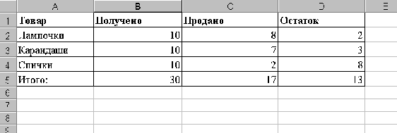 Рис.7. Таблица – отчет о реализации. Так будет выглядеть экран по окончанию работы (см. рис. 7). Весь «фокус» заключается в том, что Вы не заполняете те поля, которые можно рассчитать, а вводите только первичную информацию, в данном случае столбцы «Товар», «Получено», и «Продано», а все подсчеты выполняет программа. На самом деле, чтобы Ваша таблица выглядела так как показано выше Вы должны ввести следующее: