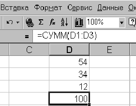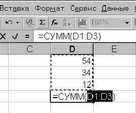 Рис.9. Строка формул Информационные связи. В программе Excel довольно легко ввести ссылку на ячейку, расположенную в другой таблице. После установления ссылки значения, находящиеся в ячейках, будут автоматически обновляться. Для обращения к значению ячейки, расположенной на другом рабочем листе, нужно указать имя этого листа вместе с адресом соответствующей ячейки. Например, для обращения к ячейке В3 на рабочем листе Лист2 необходимо ввести формулу: =Лист2!B3. Адреса ячеек должны быть указаны латинскими буквами.