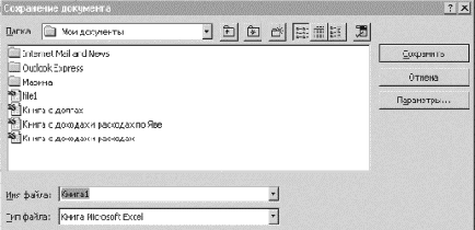 Рис.2. Вид диалога сохранения нового документа Имеются возможности настройки режима автосохранения файлов через определенные промежутки времени, режима резервного копирования и режима защиты данных (сохранение документа с паролем). Структура документовМногомерные документы (блокноты, папки) - одно из важнейших новшеств программы Excel 97, позволяющее значительно упростить и ускорить работу с таблицами и управление рабочими листами. В новой версии рабочие документы могут содержать до 255 таблиц, диаграмм или VBA-программ в одном файле, а принцип работы с ними напоминает обычную работу с деловыми блокнотами в любом офисе. В каждом рабочем блокноте можно поместить всю деловую информацию, относящуюся к одной теме, и хранить ее в одном файле, что позволяет значительно повысить наглядность рабочих документов. Отдельные рабочие листы одного документа расположены друг под другом. С помощью именного указателя (регистра имен), расположенного в нижней части экрана, можно переходить с одного листа на другой. На именном указателе находятся корешки рабочих листов, расположенные в порядке возрастания номеров: Лист1, Лист2 и т.д. Пользователь может добавить в документ элементы следующих типов: - рабочие листы для создания таблиц; - диаграммы (в качестве элемента таблицы или на отдельном листе); - рабочий лист для записи макрокоманды в виде программного модуля; - рабочий лист для создания диалогового окна. Новый лист всегда вставляется перед активным рабочим листом. Пользователь может щелкнуть по названию рабочего листа правой кнопкой мыши, после чего откроется контекстное (зависящее от ситуации) меню, в котором также имеется директива добавления. Если нужно удалить рабочий лист, нужно открыть щелчком правой кнопки мыши контекстное меню и выполнить директиву удаления.