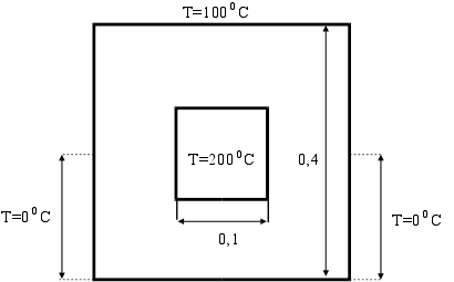 Реферат: Температурный расчет с помощью вычислений информационной математикиРеферат: Температурный расчет с помощью вычислений информационной математикиПостановка задачи. По длинной квадратного сечения трубе течет горячая жидкость. Труба наполовину погружена в ледяную ванну, так, что температура нижней половины поверхности трубы равна 00 С. Верхняя плоскость трубы имеет постоянную температуру 100 0 С. На участке между ледяной ванной и верхней плоскостью температура наружной поверхности трубы изменяется линейно по высоте от 0 0 С до 100 0 С. Жидкость внутри трубы имеет температуру 200 0 С.