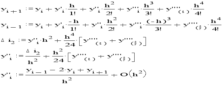 С помощью этой разности можно приближонно вычислить значение второй производной y`` в i-й точке.Используем теперь 5 членов разложения в ряд Тейлора: