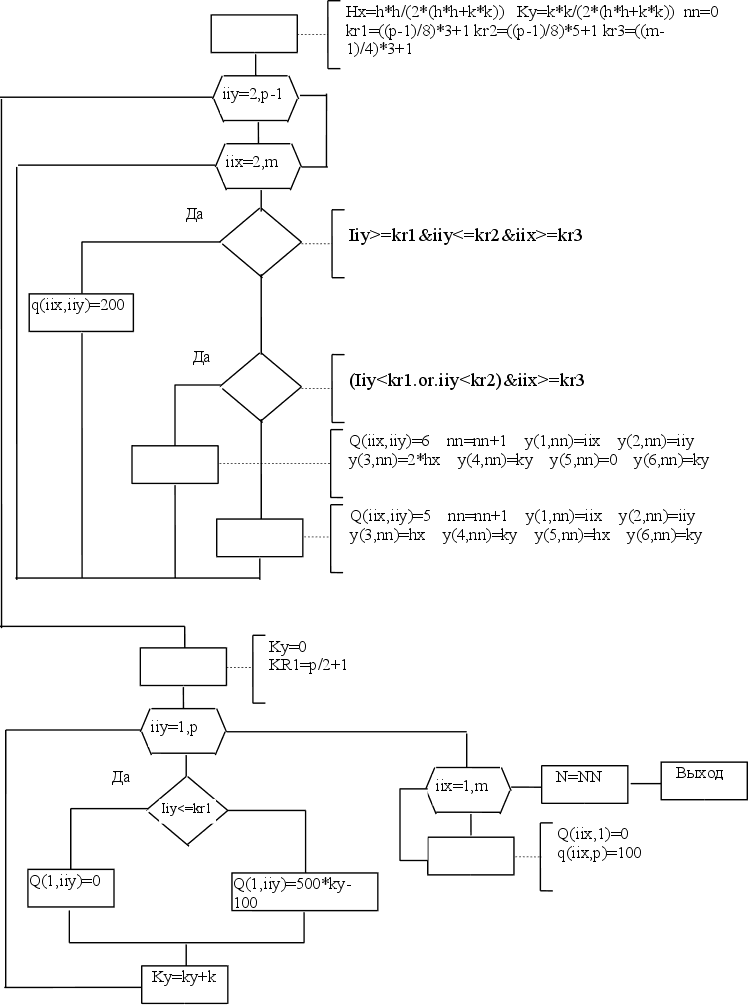 a(11)/'.','+','*','','','-','-','-','' integer M,P,I,J real q(M,P) do J=P,1,-1 print '(400A2)',(a(int(q(I,J)/21)+1),I=1,M), + (a(int(q(I,J)/21)+1),I=M-1,1,-1) enddo do I=1,10 print *,'''',a(I),'''','---> от ',20*(I-1),', до ', + 20*I,'(включительно)' enddo end c------------------------------------------------------------------ c ПОДПРОГРАММА ВЫЧИСЛЕНИЯ ОШИБКИ c real q-массив значений Y с шагом =2*h c real qq-массив значений Y с шагом =h c real E-значение погрешности c c------------------------------------------------------------------ subroutine mistake(M,P,q,qq,E) integer M,P,iq,jq,iqq,jqq real qq(M,P),q(int(M/2)+1,int(P/2)+1),max,E,other max=0 iq=0 do iqq=1,P,2 iq=iq+1 jq=0 do jqq=1,M,2 jq=jq+1 other=abs(q(jq,iq)-qq(jqq,iqq)) if (other.gt.max)max=other enddo enddo print *,M,' ',P,' ',max/3 if (max/3.lt.E) then call outdata(M,P,qq) Stop endif end c------------------------------------------------------------------ c ОСНОВНАЯ ПРОГРАММА c c c------------------------------------------------------------------ integer N/90000/,M,P,flag/0/ real y(6,90000),q(300,300),H/.05/,K/.05/,E/.5/,qq(300,300) real EZ/.01/ c print *,'Введите шаг вдоль оси X ' c read (*,*)H c print *,'Введите шаг вдоль оси Y ' c read (*,*)K c print *,'Введите точность вычислений ' c read (*,*)E M=.2/H+1 P=.4/K+1 call mkr(H,K,N,y,M,P,q) call zeidel(N,y,M,P,q,EZ) 111 H=H/2 K=K/2 M=.2/H+1 P=.4/K+1 N=90000 if (flag.eq.0)then flag=1 call mkr(H,K,N,y,M,P,qq) call zeidel(N,y,M,P,qq,EZ) call mistake(M,P,q,qq,E) else flag=0 call mkr(H,K,N,y,M,P,q) call zeidel(N,y,M,P,q,EZ) call mistake(M,P,qq,q,E) endif goto 111 end Литература. 1. И.С.Березин,Н.П.Жидков ’Методы вычислений’,том 1,М.,1966,632 стр. 2.’ Численные методы решения задач на ЭВМ ’ , Учебное пособие , Г.Н.Рубальченко , К. , 1989 , 148 стр. 3.’Справочник языка ФОРТРАН’ , М.,1996 ,106 стр. Температурный расчет с помощью вычислений информационной математики. |