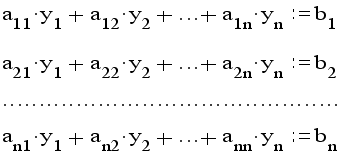 Предполагая, что диагональные коэффициенты aii<>0 (i=1,2,..,n) разрешим первое уравнение относительно y1 , второе - относительно y2 и т.д. Тогда получим эквивалентную систему