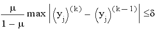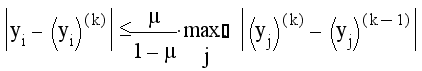 Такую систему будем в дальнейшем называть приведенной. Метод Зейделя заключается в следующем. Выбрав вектор начального приближения y(ср)=(y1,y2,...,yn) подставим его компоненты в правую часть первого уравнения системы и вычислим первую компоненту y`1 нового вектора y`(ср) . В правую часть второго уравнения подставим компоненты (y`1,y2,y3,...,yn) и вычислим вторую компоненту y`2'нового вектора. В третье уравнение подставим (y`1,y`2,y3,...,yn) и т.д. Очевидно,подстановкой в каждое уравнение мы, дойдя до последнего уравнения, обновим все компоненты исходного вектора и получим первое приближение к решению y`(ср)=(y`1,y`2,y`3,...,y`n) Далее , взяв в качестве исходного вектор у`(ср) , выполним вторую итерацию и получим y``(ср). Этот процесс будем продолжать до достижения заданной степени точности. Оценка погрешности приближений процесса Зейделя Для оценки погрешности прежде всего вычисляют показатель скорости сходимости
