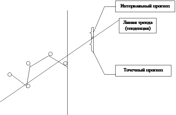 Рис. 1.3. Согласование двух подходов к прогнозированию 6) По способу представления: - точечный прогноз предполагает, что данный вариант имеет единственное значение прогнозируемого показателя; -интервальный прогноз - это предсказание будущего, в котором предполагается некоторый интервал, диапазон значений прогнозируемого показателя (рис. 1.4). Социально-экономические прогнозы традиционно разрабатываются поэтапно: 1 этап. Подготовка материалов (сбор, анализ и корректировка) по прогнозируемой проблеме. 2 этап. Разработка (и корректировка) отдельных долгосрочных, среднесрочных и текущих научно-технических и социально-экономических прогнозов: 2.1 .анализ тенденций и проблем; 2.2.разработка прогнозов в составе предполагаемой комплексной программы.