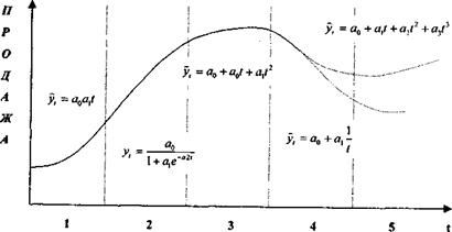 Рис. 2.3. Моделирование тенденции продажи товара по стадиям жизненного цикла Условные обозначения: 1 - выведение товара на рынок; 2 - рост; 3 - зрелость; 4 - упадок; 5 - реанимация спроса. Внутригодовая цикличность носит часто сезонный характер. При изучении сезонных процессов часто применяется спектральный анализ, который позволяет прогнозировать тенденции, динамика которых содержит колебательные или гармонические составляющие [31]. Сезонные волны можно описать гармоникой ряда Фурье: ŷ=α0+∑mk(αk coskt + bk sinkt), (2.9) где t- номер гармоники ряда Фурье; ао и аk, bk — определяют по МНК; k - число гармоник (1,2,...) В условиях переходной экономики возрастает значимость прогнозирования жизненного цикла товара (ЖЦТ). Автором концепции ЖЦТ считается известный маркетолог Теодор Левитт, предложивший ее в 1965г. Суть прогноза заключается в том, чтобы определить, как надолго и насколько интенсивно будет сохраняться спрос на данный товар. Прогноз ЖЦТ - многоплановый процесс, важной составляющей которого является подбор для каждого этапа соответствующей трендовой модели, отражающей не только рост, стабилизацию или спад, но и степень ускорения или замедления этих процессов. Такой прогноз является составным элементом прогнозирования покупательного спроса и рыночной конъюнктуры. Жизненный цикл товара можно графически смоделировать в виде сложной кривой (рис. 2.3). Математически смоделировать весь жизненный цикл товара практически невозможно, пришлось бы использовать сложную многочленную функцию, которую трудно интерпретировать. Целесообразно использовать метод линейно-кусочных агрегатов, то есть моделировать и прогнозировать каждый этап ЖЦТ с помощью трендовой и (или) многофакторной модели, отражающей закономерности каждого этапа. Отмеченные ранее методы механического выравнивания могут также выступать в роли самостоятельных методов статистического прогнозирования. Прогнозирование на основе адаптивных скользящих средних производится с использованием следующих формул: Mi = Mi-1 + (yi - yi-m) / (m), (2.10) где Mi – скользящая средняя, отнесенная к концу интервала. Mi = ŷt = (∑t+pi=1 yi) / (m). (2.11) Первый член уравнения (2.10) – Мi-1 несет «груз прошлого» - инерцию развития, а второй адаптирует среднюю к новым условиям. Таким образом, средняя как бы обновляется, «впитывая» информацию о фактически реализуемом процессе (степень обновления определяется весом 1/т). Экспоненциальные средние. Влияние прошлых наблюдений должно затухать по мере удаления от момента, для которого определяется средняя. Для этой цели используют экспоненциальное сглаживание, применяемое в краткосрочном прогнозировании (идея Н.Винера): Qt = α · yt + (1+α) · Qt-1, (2.12) где Qt - экспоненциальная средняя на момент t; а - коэффициент, характеризующий вес текущего наблюдения (параметр сглаживания). При расчете по формуле (2.12) необходимо выбрать Qt-1. Часто Qt-1 принимают равным yt. Применение метода успешно, когда ряд имеет достаточно большое число уровней. Чем меньше а, тем больше роль «фильтра», поглощающего колебания 0< а <1. Практически диапазон а ограничивается величинами 0,1; 0,3. Хорошие результаты дает а = 0,1. При выборе а следует иметь в виду, что для повышения скорости реакции на изменение процесса развития необходимо повысить а, однако это уменьшает «фильтрационные» возможности средней. Специфика экономических процессов состои