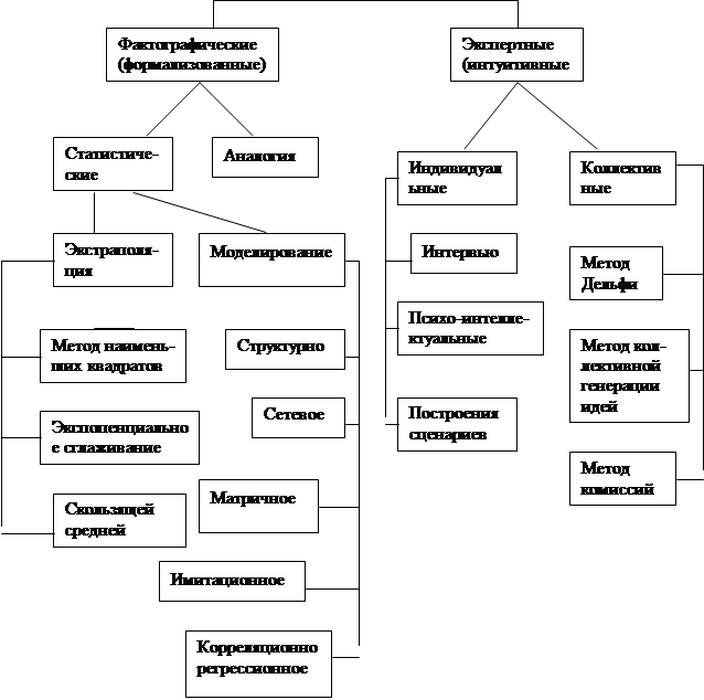 Далее определяется две простые характеристики s и d: s=∑st, (1.10) d=∑dt, (1.11) где: st = ut+lt, и dt=ut-lt, (1.12) Суммирование в формулах (1.10) и (1.11) производится по всем членам ряда. Полученные показатели s и d используются для проверки гипотезы об отсутствии тенденции (s - б средней, d - в дисперсии) в динамике исследуемого экономического показателя. Проверку гипотезы проводят, применяя t-критерий Стьюдента, то есть определяя: tн=(d-0)/(σ1), (1.13) tн=(s-µ)/( σ2), (1.14) где µ — математическое ожидание величины s; σ - средние квадратические 0, изменения величин s и d. Значения, µ, σ1 и σ2 табулированы. Если tн ≥ tкр то гипотеза о наличии тенденции отвергается, tкр находят по таблицам критических точек распределения Стьюдента в зависимости от уровня значимости гипотезы а (обычно выбирается на уровне 0,05) и числа степеней свободы k: k = n – 1, (1.15) где n — число уровней ряда. Если же tn <tкр, то гипотеза принимается, и для исследуемого объекта характерна инерционность второго рода. Данный метод достаточно прост и легко может применяться в практических разработках. После проверки типа инерционности экономической системы (объекта) необходимо перейти к подбору адекватного метода прогнозирования, а также параметрических моделей в соответствии с алгоритмом, показанным к количественным расчетам и верификации результатов. 2. МЕТОДЫ ЭКОНОМИЧЕСКОГО ПРОГНОЗИРОВАНИЯ 2.1. Классификация и область применения методов прогнозирования Выбор конкретного метода является одной из наиболее важных задач прогнозирования. Возрастание актуальности разработки формальных, в том числе логических процедур, при выборе метода прогнозирования отмечает в своих работах Глущенко В.В. [8,9]. При этом можно указать три основные группы причин, влияющих на необходимость выбора метода прогнозирования. Первая группа состоит в увеличении числа методов прогнозирования, которое и в перспективе будет возрастать в связи с разнообразием практических задач прогнозирования (в настоящее время число методов прогнозирования приближается к двумстам). Вторая группа причин заключается в том, что в современных неопределенных условиях (переходный период, экономический кризис) существенно возрастает сложность как самих решаемых задач, так и объектов прогнозирования (создание корпоративных групп, холдингов, объединений и других сложных организационно-производственных структур). Третья группа причин связана с возрастанием динамичности (подвижности) рыночной среды, ускорением темпов инновационного процесса. Поэтому на выбор конкретного метода прогнозирования влияют: • существо проблемы, подлежащей решению; • динамические характеристики объекта прогнозирования; • вид и характер информационного обеспечения; • выбранный период упреждения прогноза (и его соотношение с продолжительностью цикла разработки товара или услуги); • требования к результатам прогнозирования (точности, надежности и достоверности). Следует иметь в виду, что названные факторы должны рассматриваться в системном единстве. Для выбора наиболее подходящего метода прогнозирования на предпрогнозном этапе необходимо структурировать информацию об объекте прогнозирования, проанализировать ее (оценить полноту, непротиворечивость, сопоставимость и соизмеримость данных, точность и достоверность информации). Первоначально необходимо выделить из числа о