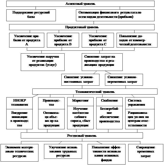 Рис.2.3. Вариант построения дерева целей Графом называют фигуру, состоящую из точек, называемых вершинами, и соединяющих их отрезков, называемых ребрами. Выбор структуры графа определяется существом тех отношений между элементами системы, которые он должен выразить. Деревом называется сводный ориентированный граф, не содержащий петель. Каждая пара его вершин соединяется ребром. Деревом целей называется граф-дерево, выражающее отношения между вершинами, являющимися этапами или проблемами, подлежащими решению при достижении некоторой цели (рис. 2.3). Дерево целей, вершины которого ранжированы, т.е. выражены количественными оценками их важности, может быть использовано для количественной оценки приоритета различных направлений развития. Построение дерева целей требует решения многих прогнозных задач, таких, как: • прогноз развития объекта в целом; • формулировка сценария достижения прогнозируемой цели; • формулировка уровня цели; • формулировка критерия и весов, ранжирование вершин. Дерево целей обычно строится на нескольких уровнях: 1. Понятийном (аспектом, параметрическом), где основная цель имеет скорее качественное, чем количественное выражение. 2. Продуктовом (предметном), где процесс достижения цели разбивается на решение задач по отдельным видам продукции. 3. Технологическом - процесс достижения цели разбивается по отдельным стадиям производственного процесса и стадиям жизненного цикла товара (товаром при этом может считаться как сама добываемая нефть, так и нефтяное месторождение). 4. Ресурсном ~ цели делятся по видам ресурсов, необходимых для производства. Иерархическое дерево целей строится на логической основе сверху вниз, исходя из сценария, поэтапно, уровень за уровнем, так, чтобы мероприятия предыдущего уровня обеспечивали задачи последующего. Для каждого уровня дерева целей эксперты должны устанавливать коэффициенты относительной важности всех его этапов. Расчет коэффициента относительной важности вдоль ветви дерева цели учитывает связи элемента данного уровня с одним или несколькими элементами вышестоящего уровня и определяется как сумма произведений соответствующих коэффициентов относительной важности. При разработке подсистем (задач), входящих в данное дерево целей, принимаются во внимание возможности частичного использования результатов одних подсистем для других, характеризуемые коэффициентами взаимной полезности. Эти коэффициенты экспортно оцениваются специалистами и выражают относительное снижение затрат времени и других ресурсов. Прогнозирование по аналогии