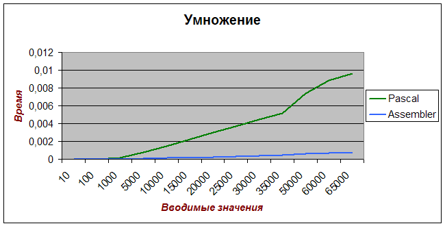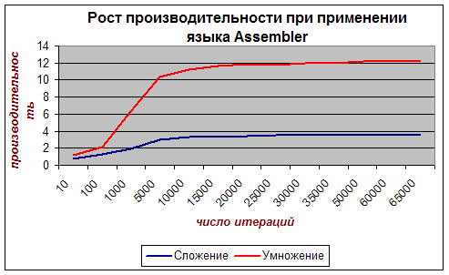 Проанализируем для каждого из двух случаев: Сложение. При применении языка Assembler рост производительности наблюдается от 10 итераций до 25000 и дальше стремиться к постоянному значению равному ~3,7. Даже такое увеличение производительности заметно скажется на работе некоторых приложений, использующих большие вычисления. Умножение. С умножением дело обстоит немного иначе: производительность резко увеличивается (от 1 до 10,3) при изменении числа итераций от 10 до 5000 и дальше выравнивается, стремясь к постоянному значению. Можно заметить, что даже при небольшом объеме вычисления наблюдается колоссальный рост производительности. По сравнению со сложением, производительность гораздо выше, хотя время выполнения этих операций в отдельности имеет несущественное различие, но при выполнении этих операций в цикле лидирующее положение занимает умножение. При имеющихся у нас данных мы можем смело сделать выводы, что компилятор языка Pascal (и многих других языков программирования) расходует ресурсы микропроцессора неэкономно, тратя много времени на различные «лишние» действия, которые приводят, как мы заметили, к заметному снижению производительности. Проанализируем порядок выполнения операции на языке Pascal, чтобы найти так называемые «лишние» действия. Вводятся значения и располагаются в оперативной памяти компьютера. Далее мы должны выделить память, так же в ОЗУ, для переменной, в которой будет накапливаться результат (для нашего случая – сумма ряда, либо значение факториала). Затем при выполнении операции мы должны наши входные значения переписать в соответствующие регистры, выполнить операцию и вернуть значение обратно в память. Далее возвращённое значение потребуется для совершения следующей итерации – необходимо опять все значения из ОЗУ переписать в регистры и выполнить операцию и т.д. Как следствие всех этих операций много времени затрачивается на пересылку данных в регистры для совершения соответствующих операций и возвращение их обратно. В случае же с языком Assembler мы можем сами распорядиться тем, где хранить промежуточные данные, применяя при этом самую быструю регистровую адресацию, т.е. перемещая значения из одного регистра в другой и не тратя время на бесполезное сохранение промежуточных результатов в ОЗУ. К оперативной памяти обращение происходит всего лишь дважды: первый раз – считываем значения с клавиатуры в память, а затем из памяти в регистр; второй раз – возвращаем результаты в память для дальнейшего использования. Но и этих операций можно избежать, считывая вводимые значения, если это предусмотрено алгоритмом программы, прямо в регистры, избегая попадания их в память. Ввод можно осуществить аналогично: данные из регистров поместить прямо на экран. Сделаем окончательный вывод: на современных компьютерах, которые имеют почти безграничный потенциал для вычисления при использовании обычного программного обеспечения, применение описанного метода увеличения производительности скажется не так заметно, как хотелось бы. Но в недалёком будущем сложность программных продуктов будет расти, повысятся требования ко времени выполнения поставленных перед ПО задач, тогда производители языков программирования, в частности компиляторов, будут обязаны обращать внимание на такие тонкости как экономия времени при выч