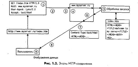 Рассмотрим более детально все этапы соединения по протоколу HTTP: 1. Формирование запроса клиентом. (Броузер формирует запрос из URL, набранного пользователем, из щелчка на ссылке либо из данных формы.) 2. Установка соединения с сервером. (Если установить соединение не удается, то на этом HTTP-транзакция закончится и клиент выдаст пользователю сообщение об ошибке.) 3. Посылка запроса и ожидание ответа от сервера. (Все, что требуется от клиента, это чтобы запрос был в корректном формате.) 4. Сервер принимает запрос. (Об этом и следующем этапе клиенту ничего не известно.) 5. Сервер обрабатывает запрос. 6. Генерация ответа. 7. Прием ответа клиентом. 8. Разрыв соединения. 9. Обработка данных клиентом. (Вывод или сохранение данных.) Обычно под запросом к серверу понимается URL (это унифицированная форма «заказа» данных на сервере). К собственно URL могут еще «прилагаться» некоторые данные, чаще всего это данные форм (вспомните, как вы вводите ключевое слово в поисковике). Формирование HTTP-запроса будет детально рассмотрено в одном из следующих уроков. При установке соединения с сервером сначала происходит трансляция символьного доменного имени, такого, как www.siemens.com, в IP-адрес, а затем осуществляется непосредственно создание TCP/IP-соединения с данным IP. Когда данные HTTP-запроса посланы серверу, клиент просто ожидает, пока не придет ответ. Пока нет обращений от клиентов, сам HTTP-сервер просто «спит» в ожидании запросов. Когда клиент устанавливает соединение, сервер «просыпается» и, приняв данные запроса, приступает к их обработке. Что именно сервер делает с запросом — известно только самому серверу. Единственный результат всех хитрых манипуляций — это выдача ответа, которого и ожидает клиент. После того как сервер выдал ответ, он разрывает соединение и вновь «погружается в сон». Естественно отметить, что в случае возникновения ошибки HTTP-транзакция может закончиться на любом из этих этапов. Все девять этапов HTTP-соединения показаны на рис. 1.2.