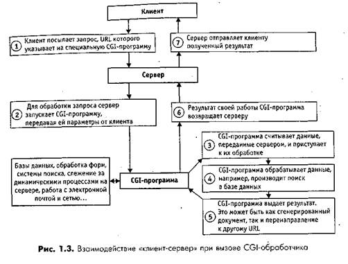 Если документ не найден или если для доступа к нему у вас нет прав (доступ к ресурсу может быть ограничен), то выдается код ошибки. А если все нормально, то информация, содержащаяся в документе, включая сопутствующие данные о его типе, выдается в виде ответа. Схема взаимодействия «клиент-сервер» для случая, когда URL указывает на CGI-обработчик, показана на рис. 1.3.