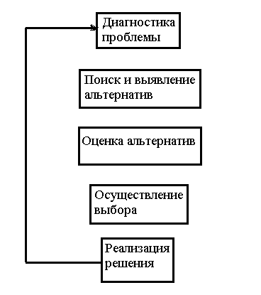 Таблица 1. отражает то общее, что имеется в различных системных подходах: определение четкой последовательности действий, учет целей и средств: выделение и последовательное рассмотрение альтернативных вариантов решения проблем, стремление к рациональному выбору между ними. Эти идеи настолько общие, что их вполне можно назвать проявлением здравого смысла. Вероятно, многие рационально мыслящие люди всегда используют эти методы при решении сложных задач. Итак, системный подход к решению проблем различного характера связан прежде всего с выделением системы из внешней среды и определением совокупности последовательных, логических шагов рассмотрения проблемы. Назовем эти черты общей схемой системного подхода. Чем же различаются системные подходы, предназначенные для решения различным проблем? В первую очередь - способами аналитического сравнения альтернатив. Так, например, в системотехнике используются стандартные методы расчета различных классов технических систем (электронных схем, систем автоматического регулирования и т.д.). При использовании подхода исследования операций имеется целый класс методов: математического программирования, вероятностные, сетевого планирования и т.д. При подходе анализа систем используется в первую очередь метод стоимость - эффективность. Есть примеры, когда общая схема системного подхода используется для решения сложных проблем без специальных способов аналитического сравнения альтернатив. Последнее время общая схема системного подхода очень популярна. Трудно найти проблему, при решении которой не рекомендовалось бы использовать системный подход. Рассмотрим подробнее этапы процесса принятия решения. Подготовка, принятие и реализация решения как процесс управленческого труда менеджера имеют определенную технологию: совокупность последовательно применяемых приемов и способов достижения целей организации. Процесс решения с технологической точки зрения можно представить в виде последовательности этапов и процедур, имеющих прямые и обратные связи. В зависимости от того, на каких аспектах в процессе решения делается акцент, можно структуризовать на отдельные этапы, руководствуясь различными принципами. Именно это было сделано нами ранее, а сейчас рассмотрим подробно этапы изучаемого процесса по технологии, предложенной авторами книги «Менеджмент» О.С.Виханским, А.И.Наумовым.