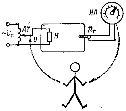 Рисунок 1. Система ручного регулирования температуры. На рис.1 представлен технологический объект – сушительный шкаф, в котором должна поддерживаться постоянная температура Q, которая измеряется измерительным прибором ИП в комплекте с термометром сопротивления Rт. Сушительный шкаф имеет электрический нагревательный элемент Н, питающийся от автотрансформатора АТ. При отклонении температуры от заданного значения, например при увеличении (падении) напряжения ис в питающей сети, человек – оператор перемещает движок автотрансформатора в направлении изменения напряжения U, соответствующем восстановлению заданного значения температуры. Так осуществляется ручное регулирование объектом температуры сушительного шкафа. Принципиальная схема взаимодействия системы «объект- оператор»при ручном регулировании температуры сушительного шкафа представлена на рис.2. Входом системы по регулирующему каналу является воздействие человека-оператора Ч-О на движок автотрансформатора АТ. Выходом системы является значение Q температуры в сушительном шкафу.